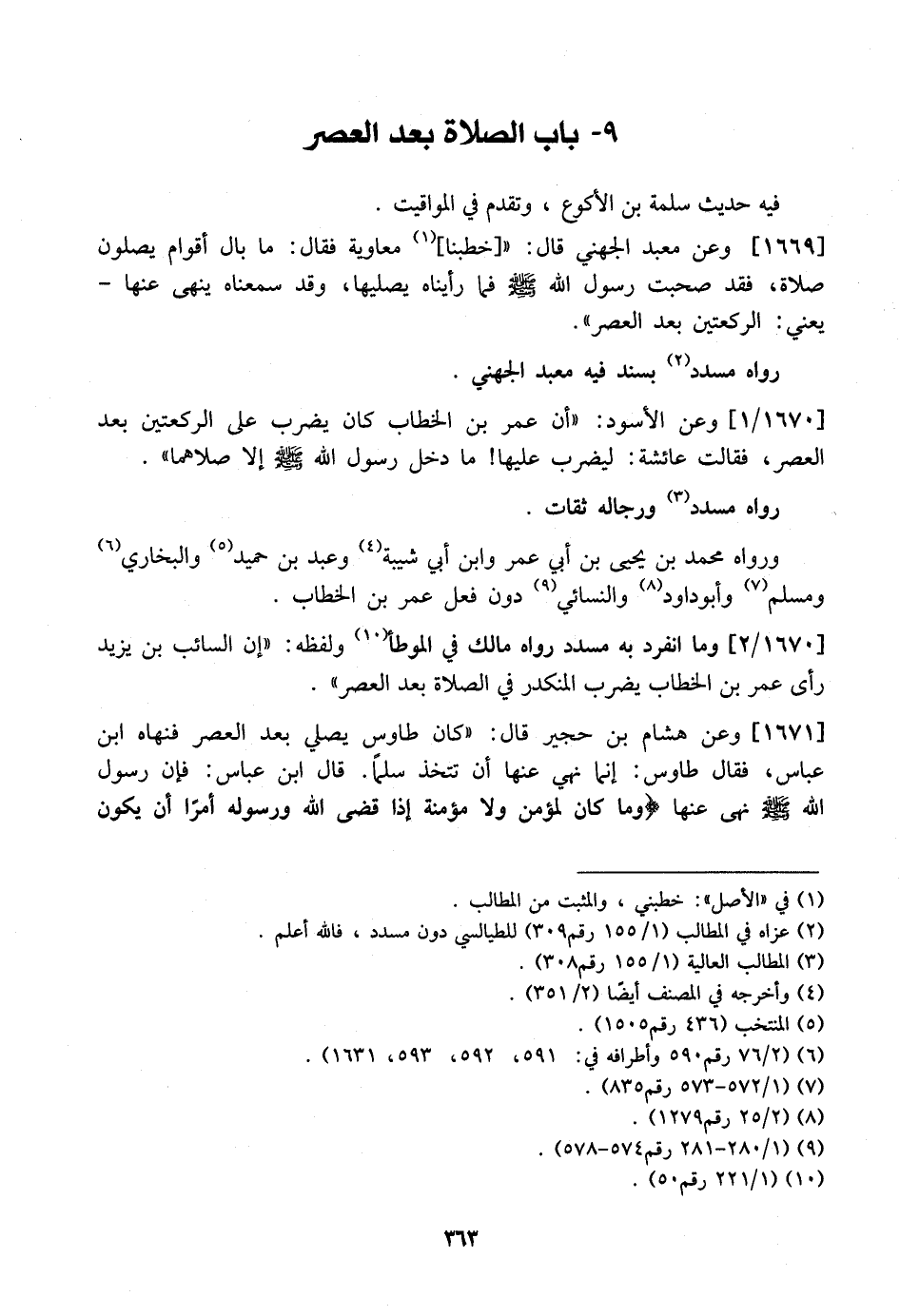1669 - وَعَنْ مِعْبَدٍ الجهني قال: "خطبنا مُعَاوِيَةُ فَقَالَ: مَا بَالُ أَقْوَامٍ يُصَلُّونَ صَلَاةً، فَقَدْ صَحِبْتُ رَسُولَ اللَّهِ - صَلَّى اللَّهُ عَلَيْهِ وَسَلَّمَ - فَمَا رَأَيْنَاهُ يُصَلِّيهَا، وَقَدْ سَمِعْنَاهُ يَنْهَى عَنْهَا- يَعْنِي: الرَّكْعَتَيْنِ بَعْدَ الْعَصْرِ".