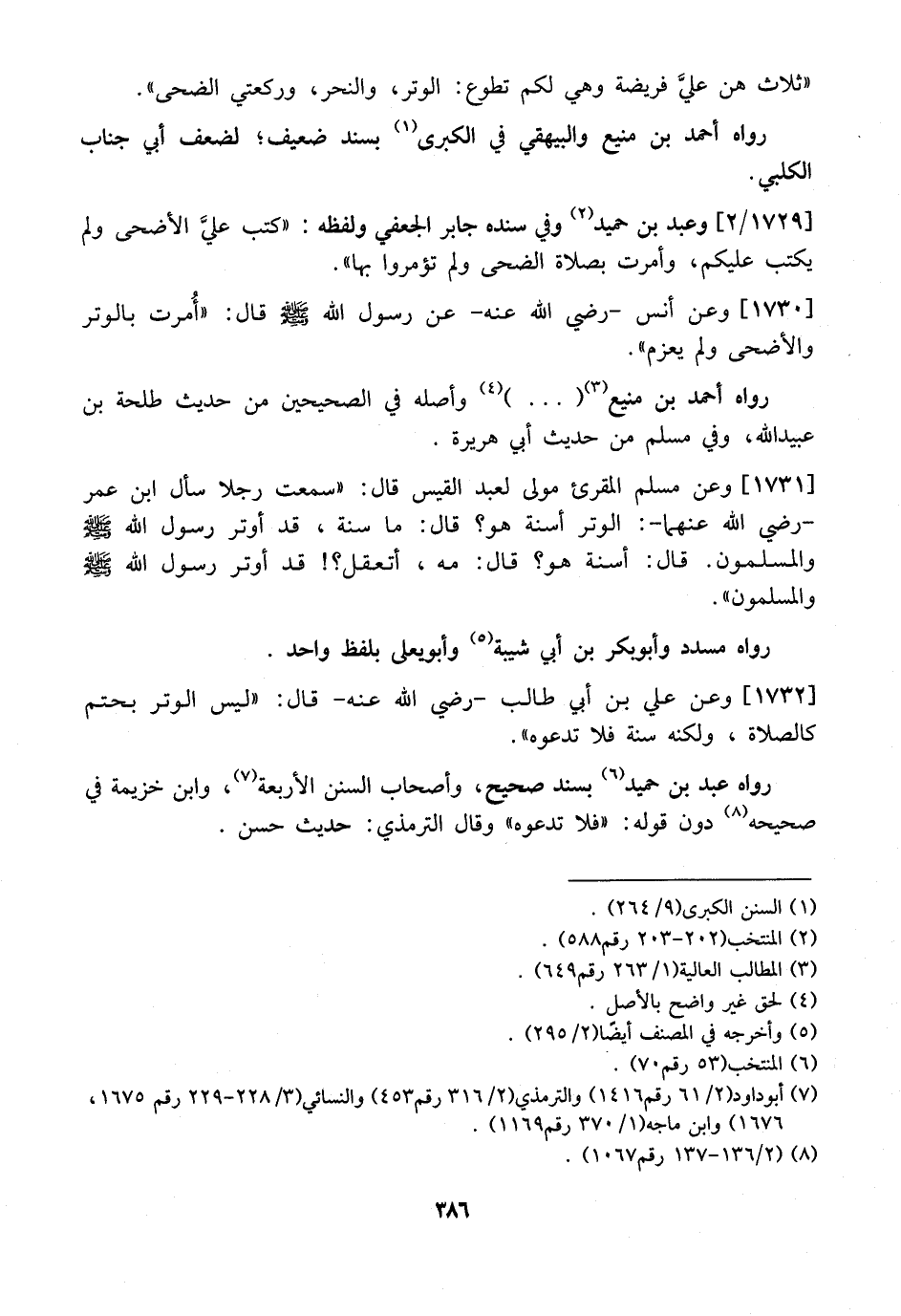 1732 - وَعَنْ عَلِيِّ بْنِ أَبِي طَالِبٍ- رَضِيَ اللَّهُ عَنْهُ- قَالَ: "لَيْسَ الْوِتْرُ بِحَتْمٍ كَالصَّلَاةِ، وَلَكِنَّهُ سُنَّةٌ فَلَا تَدَعُوهُ.