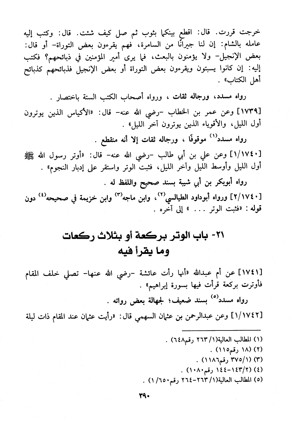 1739 - وَعَنْ عُمَرَ بْنَ الْخَطَّابِ- رَضِيَ اللَّهُ عَنْهُ- قَالَ: "الْأَكْيَاسُ الَّذِينَ يُوتِرُونَ أَوَّلَ اللَّيْلِ، وَالْأَقْوِيَاءُ الَّذِينَ يُوتِرُونَ آخِرَ اللَّيْلِ.