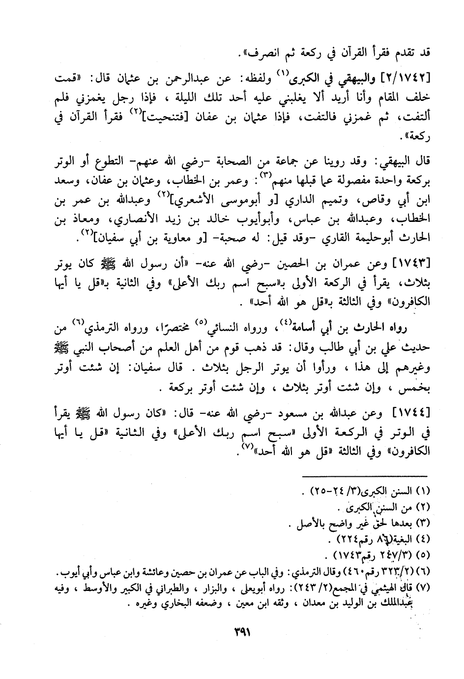 1743 - وَعَنْ عِمْرَانَ بْنِ الْحُصَيْنِ- رَضِيَ اللَّهُ عَنْهُ- "أن رسول الله - صلى الله عليه وسلم - كَانَ يُوتِرُ بِثَلَاثٍ، يَقْرَأُ فِي الرَّكْعَةِ الْأُولَى بِـ {سَبِّحِ اسْمَ رَبِّكَ الأَعْلَى} وَفِي الثَّانِيَةِ بـ {قل يا أيها الكافرون} وفي الثالثة بـ {اقل هُوَ اللَّهُ أَحَدٌ} .