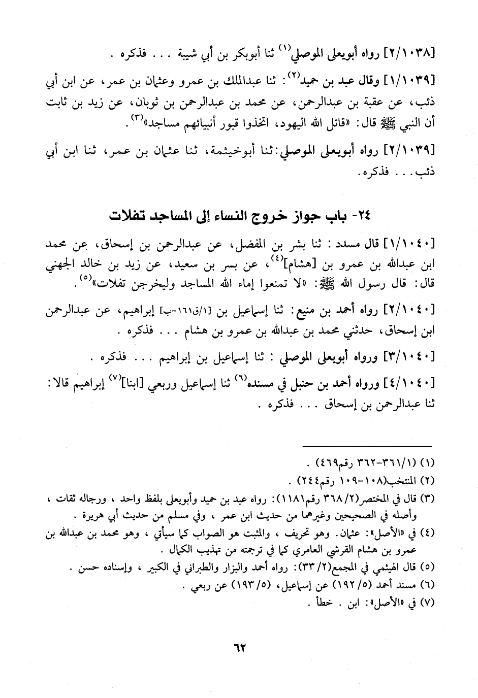 1040/1 قَالَ مُسَدَّدٌ: ثَنَا بِشْرُ بْنُ الْمُفَضَّلِ، عَنْ عَبْدِ الرَّحْمَنِ بْنِ إِسْحَاقَ، عَنْ مُحَمَّدِ بْنِ عبد الله بن عمرو بن هشام عن بسر بْنِ سَعِيدٍ، عَنْ زَيْدِ بْنِ خَالِدٍ الْجُهَنِيِّ قَالَ: قَالَ رَسُولُ اللَّهِ - صَلَّى اللَّهُ عَلَيْهِ وَسَلَّمَ -: (لَا تَمْنَعُوا إِمَاءَ اللَّهِ الْمَسَاجِدَ وَلْيَخْرُجْنَ تَفِلَاتٍ ".