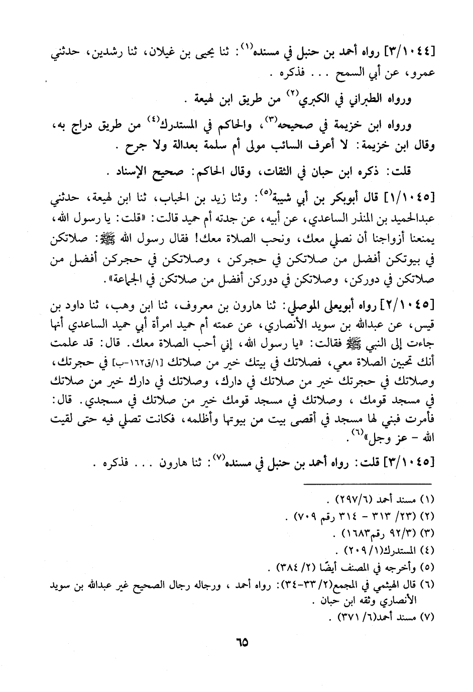 1045/2 رَوَاهُ أَبُو يَعْلَى الْمَوْصِلِيُّ: ثَنَا هَارُونُ بْنُ مَعْرُوفٍ، ثَنَا ابْنُ وَهْبٍ، ثَنَا دَاوُدُ بْنُ قَيْسٍ، عَنْ عَبْدِ اللَّهِ بْنِ سُوَيْدٍ الْأَنْصَارِيِّ، عَنْ عَمَّتِهِ أُمِّ حُمَيْدٍ امْرَأَةِ أَبِي حُمَيْدٍ السَّاعِدِيِّ أَنَّهَا جَاءَتْ إِلَى النَّبِيِّ - صَلَّى اللَّهُ عَلَيْهِ وَسَلَّمَ - فَقَالَتْ: "يَا رَسُولَ اللَّهِ، إِنِّي أُحِبُّ الصَّلَاةَ مَعَكَ. قَالَ: قَدْ عَلِمْتُ أَنَّكِ تُحِبِّينَ الصَّلَاةَ مَعِيَ، فَصَلَاتُكِ فِي بَيْتِكِ خَيْرٌ مِنْ صَلَاتِكِ فِي حُجْرَتِكِ، وَصَلَاتُكِ فِي حُجْرَتِكِ خَيْرٌ مِنْ صَلَاتِكِ فِي دَارِكِ، وَصَلَاتُكِ فِي دَارِكِ خَيْرٌ مِنْ صَلَاتِكِ فِي مَسْجِدِ قَوْمِكِ، وَصَلَاتُكِ فِي مَسْجِدِ قَوْمِكِ خَيْرٌ مِنْ صَلَاتِكِ فِي مَسْجِدِي قَالَ: فَأَمَرَتْ فَبُنِيَ لَهَا مَسْجِدٌ فِي أَقْصَى بَيْتٍ مِنْ بِيُوتِهَا وَأَظْلَمِهِ، فَكَانَتْ تُصَلِّي فِيهِ حَتَّى لَقِيَتِ اللَّهَ- عَزَّ وَجَلَّ ".