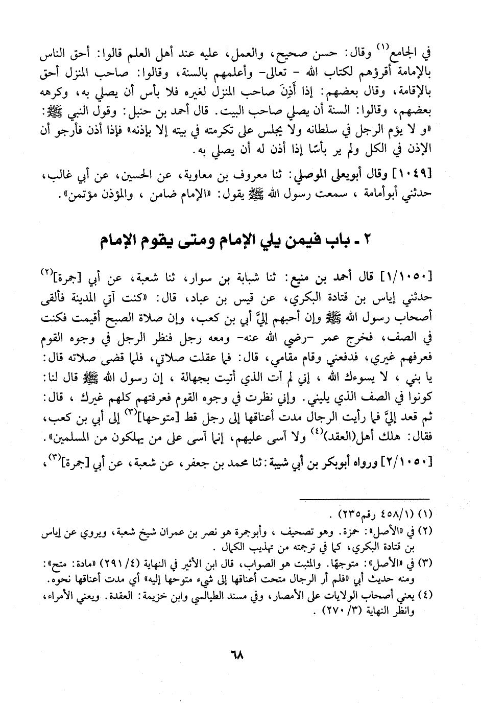 1050/1 قَالَ أَحْمَدُ بْنُ مَنِيعٍ: ثَنَا شَبَابَةُ بْنُ سَوَّارٍ، ثنا شُعْبَةُ، عَنْ أبي جمرة، حَدَّثَنِي إِيَاسُ بْنُ قَتَادَةَ الْبَكْرِيُّ، عَنْ قَيْسِ بْنِ عُبَادٍ، قَالَ: "كُنْتُ آتِي الْمَدِينَةَ فَأَلْقَى أَصْحَابِ رَسُولِ اللَّهِ - صَلَّى اللَّهُ عَلَيْهِ وَسَلَّمَ - وَإِنَّ أَحَبَّهُمْ إليَّ أُبَيُّ بْنُ كَعْبٍ، وَإِنَّ صَلَاةَ الصُّبْحِ أُقِيمَتْ فَكُنْتُ فِي الصَّفِّ، فَخَرَجَ عُمَرُ- رَضِيَ اللَّهُ عَنْهُ- وَمَعَهُ رَجُلٌ فَنَظَرَ الرَّجُلُ فِي وُجُوهِ الْقَوْمِ فَعَرَفَهُمْ غَيْرِي، فَدَفَعَنِي وَقَامَ مَقَامِي، قَالَ: فَمَا عَقَلْتُ صَلَاتِي، فَلَمَّا قضى صلاته قال: يا بني، لا يسوءك اللَّهُ، إِنِّي لَمْ آتِ الَّذِي أَتَيْتُ بِجَهَالَةٍ، أن رسول الله - صلى الله عليه وسلم - قَالَ لَنَا: كُونُوا فِي الصَّفِّ الَّذِي يَلِينِي. وَإِنِّي نَظَرْتُ فِي وُجُوهِ الْقَوْمِ فَعَرَفْتُهُمْ كُلَّهُمْ غَيْرَكَ، قَالَ: ثُمَّ قَعَدَ إليَّ فَمَا رَأَيْتُ الرجال مدت أعناقها إلى رجل قط متوحها إِلَى أُبَيِّ بْنِ كَعْبٍ، فَقَالَ: هَلَكَ أَهْلُ الْعُقَدِ وَلَا آسَى عَلَيْهِمْ، إِنَّمَا آسَى عَلَى من يهلكون من المسلمين ".
