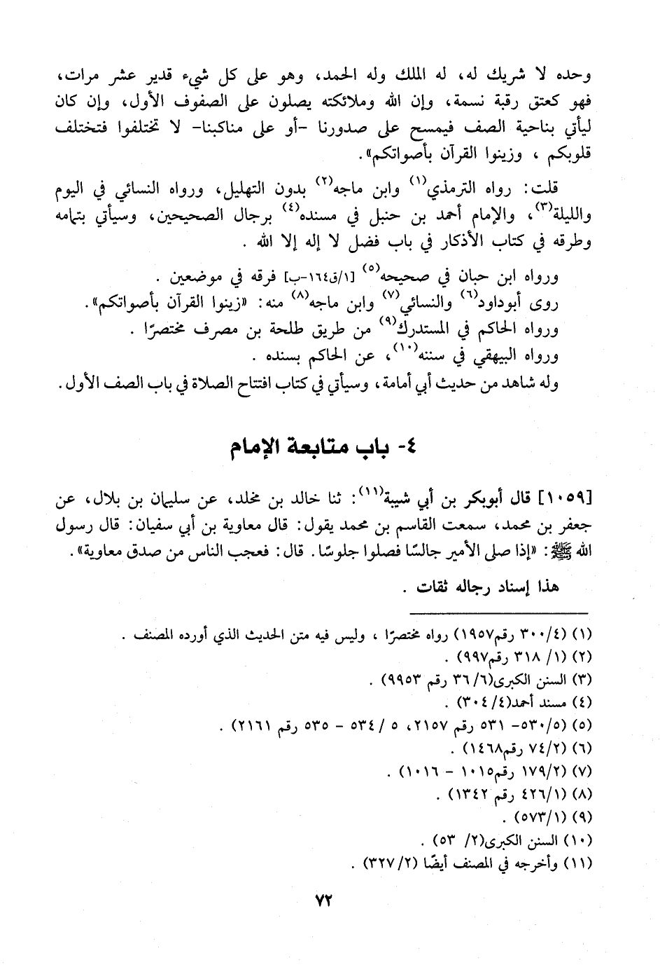 وَحْدَهُ لَا شَرِيكَ لَهُ، لَهُ الْمُلْكُ وَلَهُ الْحَمْدُ، وَهُوَ عَلَى كُلِّ شَيْءٍ قَدِيرٌ عَشْرَ مَرَّاتٍ، فَهُوَ كَعِتْقِ رَقَبَةِ نَسَمَةٍ، وَإِنَّ اللَّهَ وَمَلَائِكَتَهُ يُصَلُّونَ عَلَى الصُّفُوفِ الْأُوَلِ، وَإِنْ كَانَ ليأتي بناحية الصَّفِّ فَيَمْسَحُ عَلَى صُدُورِنَا- أَوْ عَلَى مَنَاكِبِنَا- لَا تَخْتَلِفُوا فَتَخْتَلِفَ قُلُوبُكُمْ، وَزَيِّنُوا الْقُرْآنَ بِأَصْوَاتِكُمْ ".