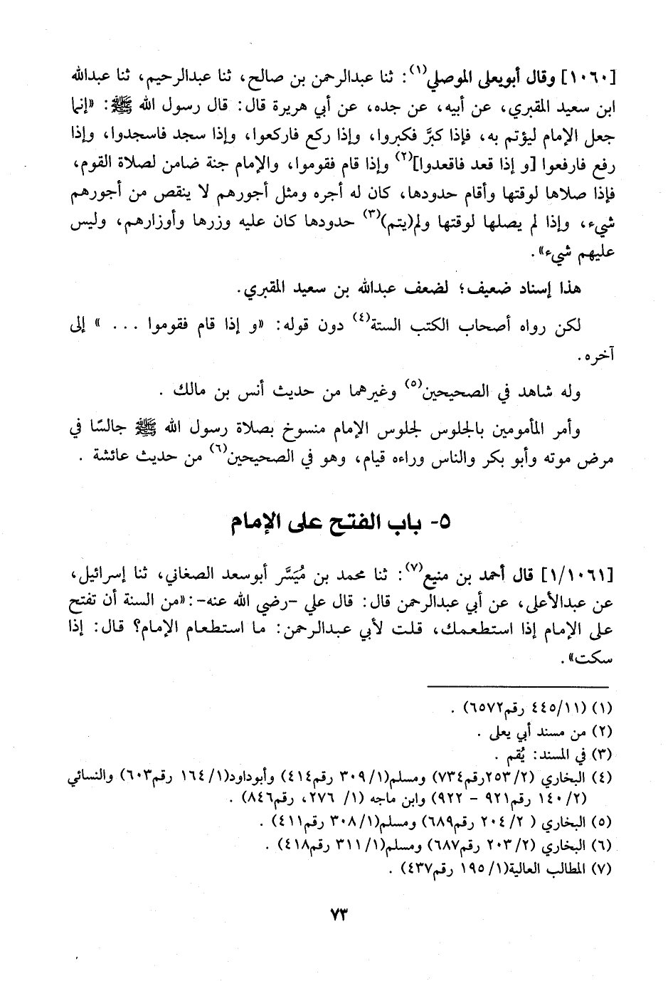 1061/1 قَالَ أَحْمَدُ بْنُ مَنِيعٍ: ثَنَا مُحَمَّدُ بْنُ مُيَسَّر أَبُو سَعْدٍ الصغاني، ثَنَا إِسْرَائِيلُ، عَنْ عَبْدِ الْأَعْلَى، عَنْ أَبِي عَبْدِ الرَّحْمَنِ قَالَ: قَالَ عَلِيٌّ- رَضِيَ اللَّهُ عَنْهُ-: "مِنَ السُّنَّةِ أَنْ تَفْتَحَ عَلَى الْإِمَامِ إِذَا اسْتَطْعَمَكَ، قُلْتُ لِأَبِي عَبْدِ الرَّحْمَنِ: مَا اسْتِطْعَامُ الْإِمَامِ؟ قَالَ: إِذَا سَكَتَ ".