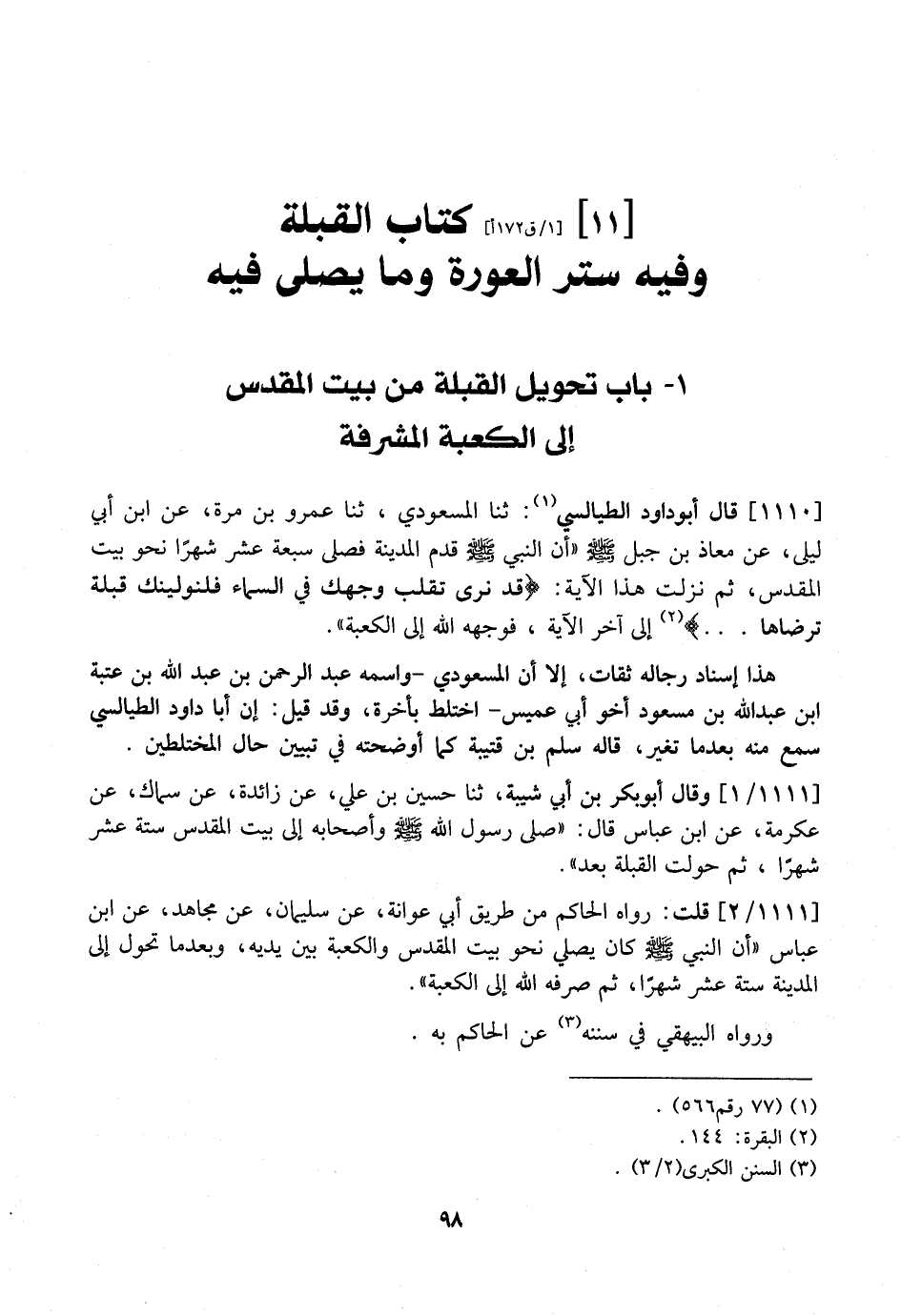 1110 - قَالَ أَبُو دَاوُدَ الطَّيَالِسِيُّ: ثَنَا الْمَسْعُودِيُّ، ثَنَا عَمْرُو بْنُ مُرَّةَ، عَنِ ابْنِ أَبِي لَيْلَى، عَنْ مُعَاذِ بْنِ جَبَلٍ- رَضِيَ اللَّهُ عَنْهُ - ((أَنّ النَّبِيَّ - صَلَّى اللَّهُ عليه وَسَلَّمَ - قَدِمَ الْمَدِينَةَ فَصَلَّى سَبْعَةَ عَشَرَ شَهْرًا نحو بيت المقدس، ثم نزلت هذا الْآيَةُ: {قَدْ نَرَى تَقَلُّبَ وَجْهِكَ فِي السَّمَاءِ فلنولينك قبلة ترضاها} إِلَى آخِرِ الْآيَةِ، فَوَجَّهَهُ اللَّهُ إِلَى الْكَعْبَةِ".