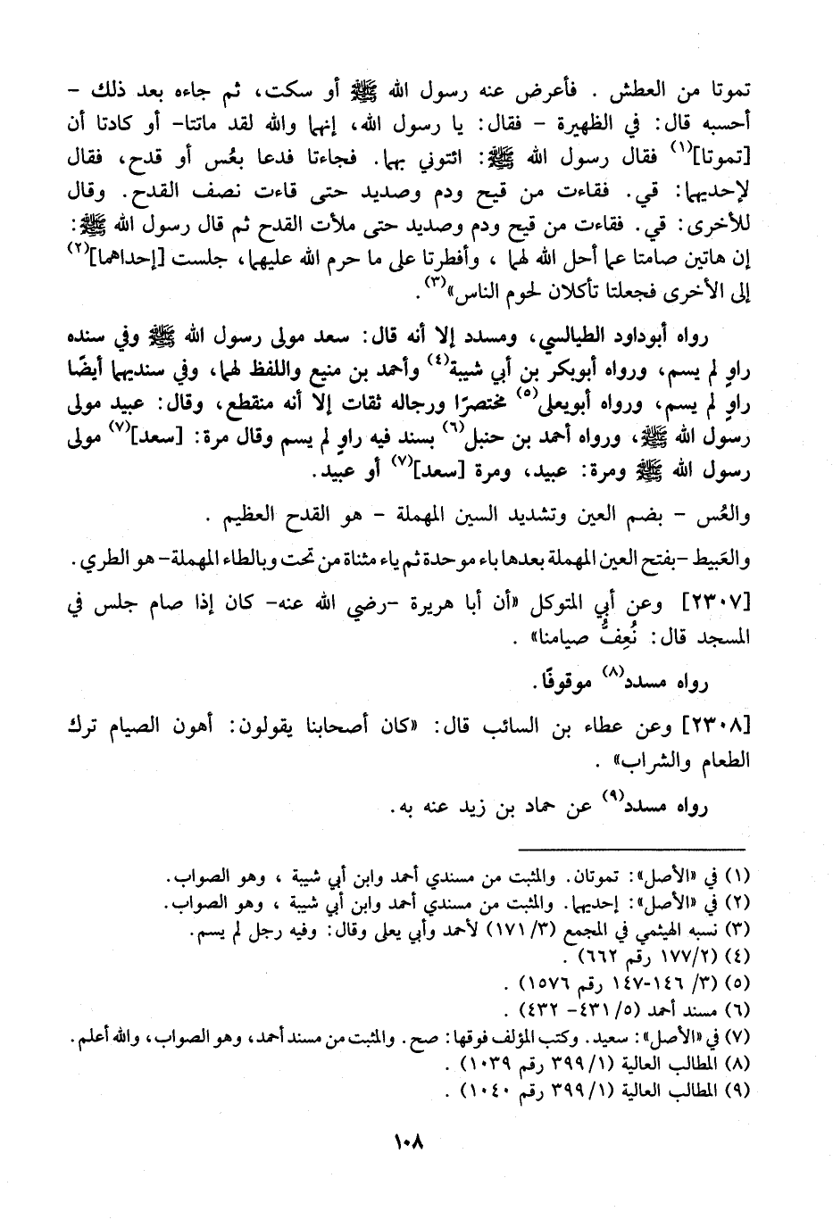 تَمُوتَا مِنَ الْعَطَشِ. فَأَعْرَضَ عَنْهُ رَسُولَ اللَّهِ - صَلَّى اللَّهُ عَلَيْهِ وَسَلَّمَ - أَوْ سَكَتَ، ثُمَّ جَاءَهُ بَعْدَ ذَلِكَ- أَحْسَبُهُ قَالَ: فِي الظَّهِيرَةِ- فَقَالَ: يَا رَسُولَ اللَّهِ، إِنَّهُمَا وَاللَّهِ لَقَدْ مَاتَتَا- أَوْ كَادَتَا أَنْ تَمُوتَا، فَقَالَ رَسُولُ اللَّهِ - صَلَّى اللَّهُ عَلَيْهِ وَسَلَّمَ -: ائتوني بِهِمَا. فَجَاءَتَا فَدَعَا بعُس أَوْ قَدَحٍ، فَقَالَ لِإِحْدَيْهِمَا: قِي. فَقَاءَتْ مِنْ قَيْحٍ وَدَمٍ وَصَدِيدٍ حَتَّى قَاءَتْ نِصْفَ الْقَدَحِ. وَقَالَ لِلْأُخْرَى: قِي. فَقَاءَتْ مِنْ قَيْحٍ وَدَمٍ وَصَدِيدٍ حَتَّى مَلَأَتِ الْقَدَحَ ثُمَّ قَالَ رَسُولُ اللَّهِ - صَلَّى اللَّهُ عَلَيْهِ وسلم -: إن هاتين صامتا عما أَحَلَّ اللَّهُ لَهُمَا، وَأَفْطَرَتَا عَلَى مَا حَرَّمَ اللَّهُ عَلَيْهِمَا، جَلَسَتْ إِحْدَاهُمَا، إِلَى الْأُخْرَى فَجَعَلَتَا تَأْكُلَانِ لُحُومَ النَّاسِ ".