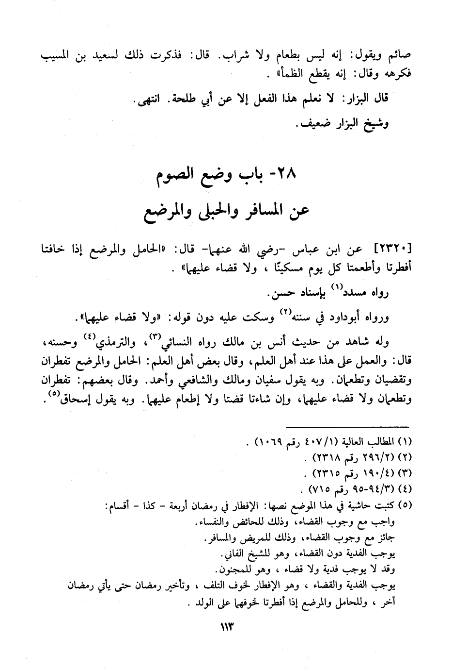 2320 - عَنِ ابْنِ عَبَّاسٍ- رَضِيَ اللَّهُ عَنْهُمَا- قَالَ: "الْحَامِلُ وَالْمُرْضِعُ إِذَا خَافَتَا أَفْطَرَتَا وَأَطْعَمَتَا كُلَّ يَوْمٍ مِسْكِينًا، وَلَا قَضَاءَ عَلَيْهِمَا".