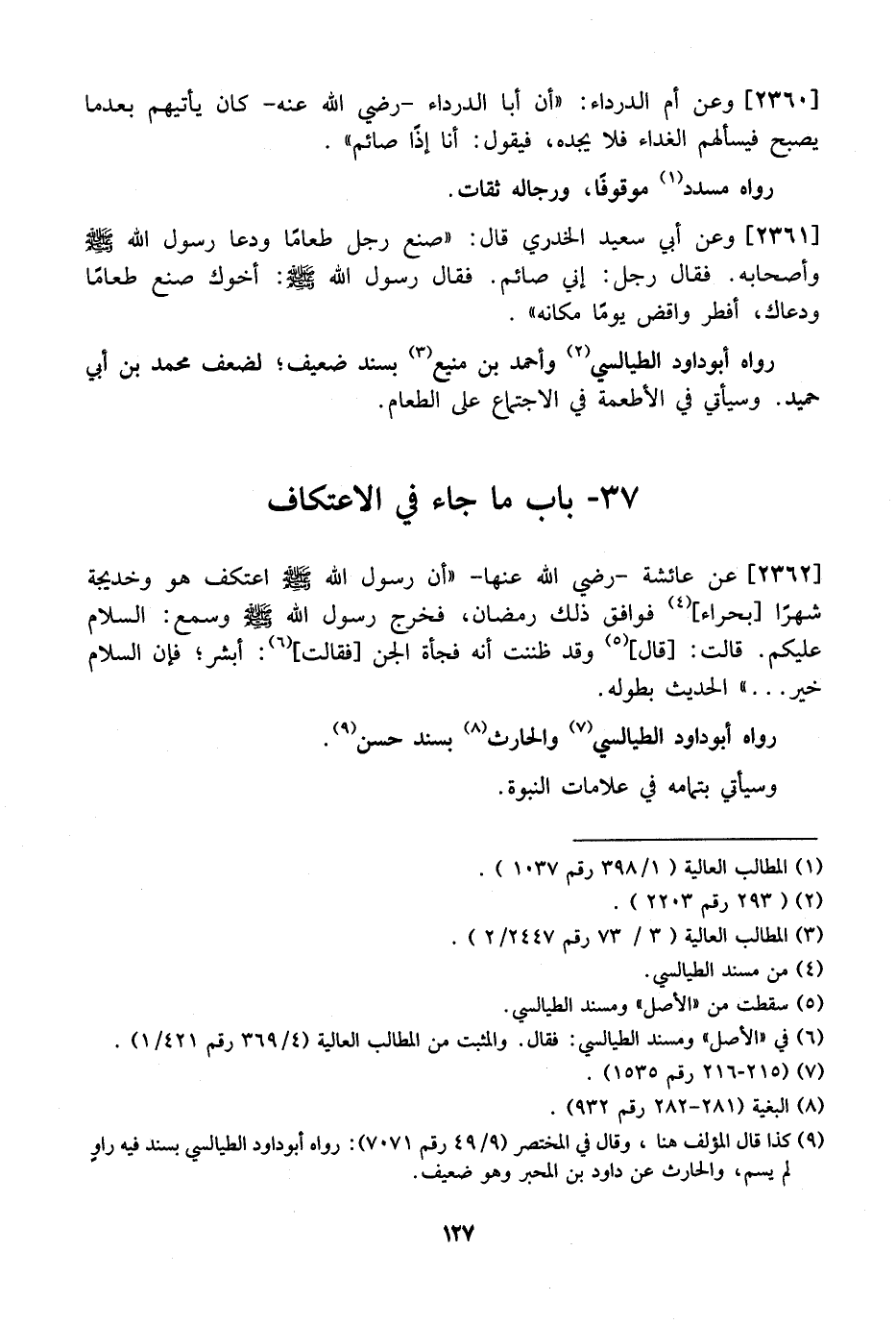 2362 - عَنْ عَائِشَةَ- رَضِيَ اللَّهُ عَنْهَا- "أَنَّ رَسُولَ اللَّهِ - صَلَّى اللَّهُ عَلَيْهِ وَسَلَّمَ - اعْتَكَفَ هَوَ وخديجة شهرًا بحراء، فَوَافَقَ ذَلِكَ رَمَضَانَ، فَخَرَجَ رَسُولُ اللَّهِ - صَلَّى اللَّهُ عَلَيْهِ وَسَلَّمَ - وَسَمِعَ: السَّلَامَ عَلَيْكُمْ. قَالَتْ: قَالَ وَقَدْ ظَنَنْتُ أَنَّهُ فَجْأَةُ الْجِنِّ فَقَالَتْ: أَبْشِرْ؛ فَإِنَّ السَّلَامَ خَيْرٌ ... " الْحَدِيثُ بِطُولِهِ. رَوَاهُ أَبُو دَاوُدَ الطَّيَالِسِيُّ وَالْحَارِثُ بِسَنَدٍ حَسَنٍ. وَسَيَأْتِي بِتَمَامِهِ فِي علامات النبوة.