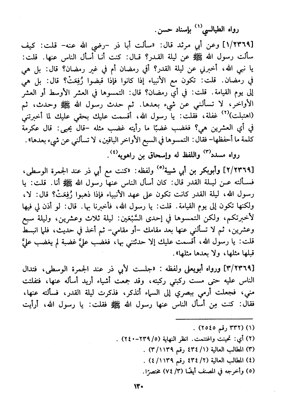 2369 / 2 - وَأَبُو بَكْرِ بْنُ أَبِي شَيْبَةَ وَلَفْظُهُ: "كُنْتُ مَعَ أَبِي ذَرٍّ عِنْدَ الْجَمْرَةِ الْوُسْطَى، فَسَأَلْتُهُ عَنْ لَيْلَةِ الْقَدْرِ قَالَ: كَانَ أَسْأَلَ النَّاسِ عَنْهَا رَسُولُ اللَّهِ - صَلَّى اللَّهُ عَلَيْهِ وَسَلَّمَ - أَنَا. قُلْتُ: يَا رَسُولَ اللَّهِ، لَيْلَةُ الْقَدْرِ كَانَتْ تَكُونُ عَلَى عَهْدِ الْأَنْبِيَاءِ فَإِذَا ذَهَبُوا رُفِعَتْ؟ قَالَ: لَا، وَلَكِنَّهَا تَكُونُ إِلَى يَوْمِ الْقِيَامَةِ. قُلْتُ: يَا رَسُولَ اللَّهِ، فَأَخْبِرْنَا بِهَا. قَالَ: لَوْ أُذِنَ لِي فِيهَا لَأَخْبَرْتُكُمْ، وَلَكِنِ الْتَمِسُوهَا فِي إِحْدَى السَّبْعَين: لَيْلَةِ ثَلَاثٍ وَعِشْرِينَ، وَلَيْلَةِ سَبْعٍ وَعِشْرِينَ، ثُمَّ لَا تَسْأَلْنِي عَنْهَا بَعْدَ مَقَامِكَ- أَوْ مَقَامِي- ثُمَّ أَخَذَ فِي حَدِيثٍ، فَلَمَّا انْبَسَطَ قُلْتُ: يَا رَسُولَ اللَّهِ، أَقْسَمْتُ عَلَيْكَ إِلَّا حَدَّثْتَنِي بِهَا، فَغَضِبَ عليَّ غَضْبَةً لَمْ يَغْضَبْ عليَّ قَبْلَهَا مِثْلَهَا، وَلَا بَعْدَهَا مِثْلَهَا".