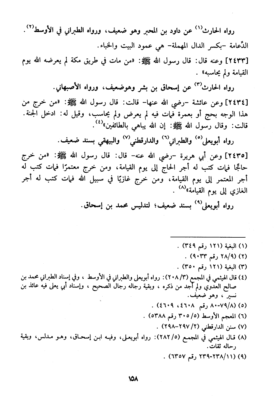 2433 - وَعَنْهُ قَالَ: قَالَ رَسُولُ اللَّهِ - صَلَّى اللَّهُ عَلَيْهِ وَسَلَّمَ -: "مَنْ مَاتَ فِي طَرِيقِ مَكَّةَ لم يعرِضهُ اللَّهُ يَوْمَ الْقِيَامَةِ وَلَمْ يُحَاسِبْهُ ".
