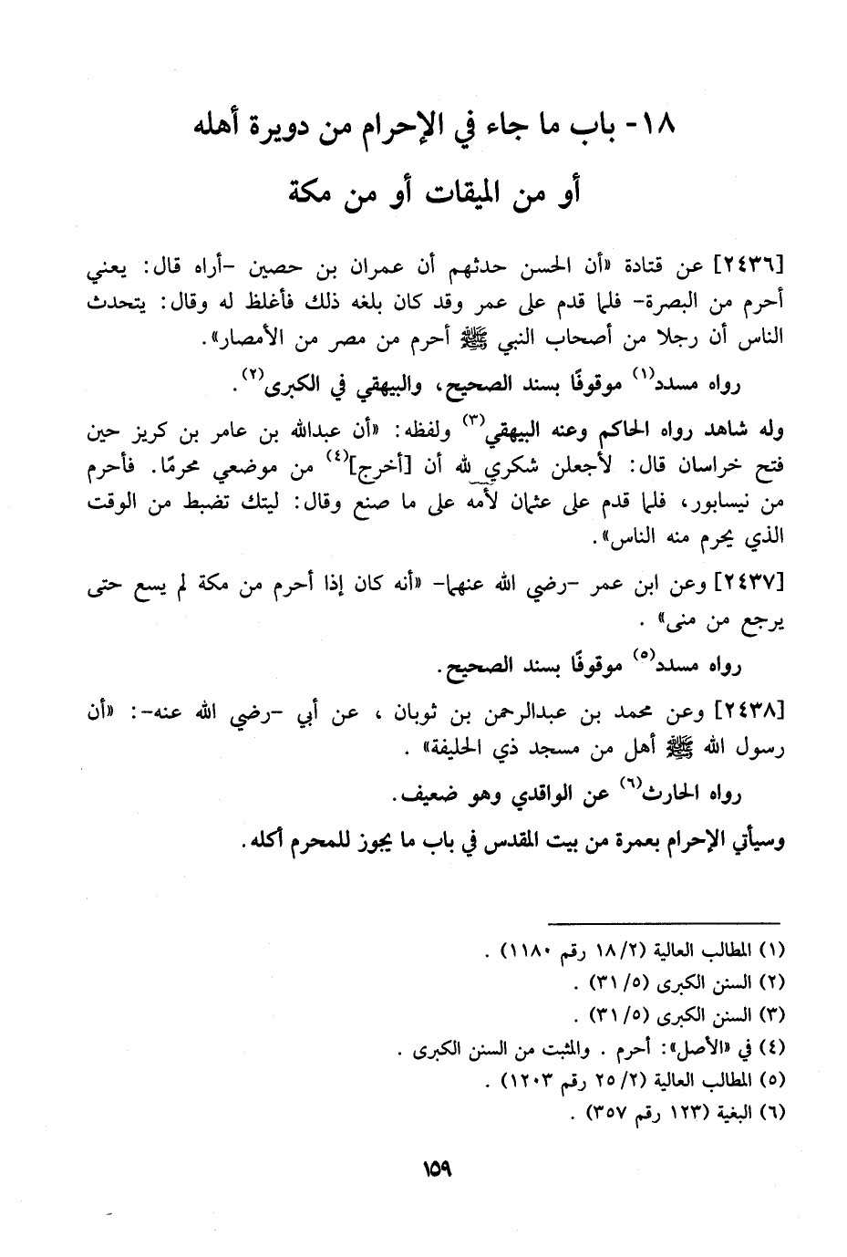 2436 - عَنْ قَتَادَةَ "أَنَّ الْحَسَنَ حَدَّثَهُمْ أَنَّ عِمْرَانَ بْنَ حُصَيْنٍ- أَرَاهُ قَالَ: يَعْنِي أَحْرَمَ مِنَ الْبَصْرَةِ- فَلَمَّا قَدِمَ عَلَى عُمَرَ وَقَدْ كَانَ بلغه ذلك فأغلظ له وَقَالَ: يَتَحَدَّثُ النَّاسُ أَنَّ رَجُلًا مِنْ أَصْحَابِ النَّبِيِّ - صَلَّى اللَّهُ عَلَيْهِ وَسَلَّمَ - أَحْرَمَ مِنْ مِصْرٍ مِنَ الْأَمْصَارِ".