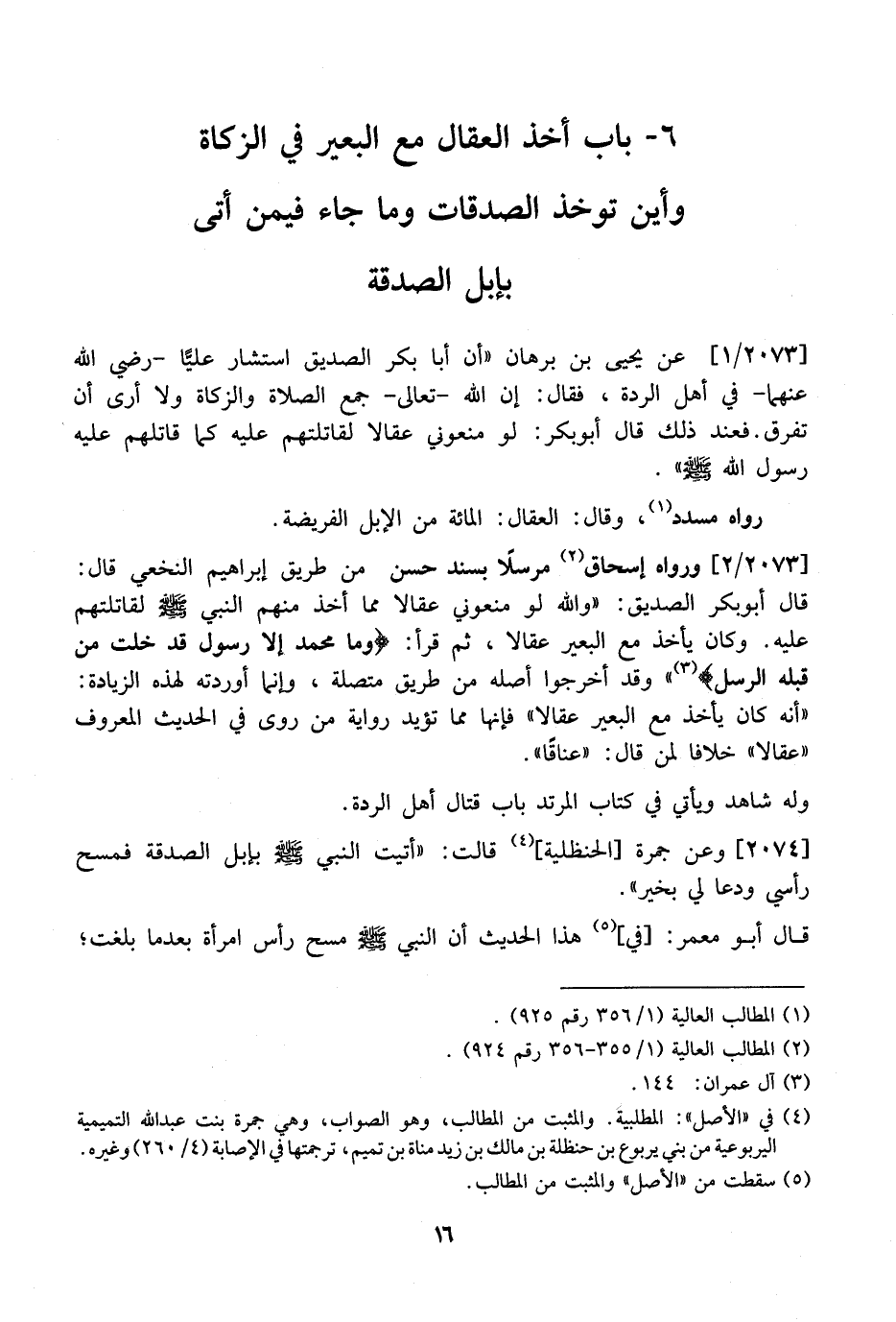 2073 / 2 - ورواه إِسْحَاقُ مُرْسَلًا بِسَنَدٍ حَسَنٍ مِنْ طَرِيقِ إِبْرَاهِيمَ النخعي قال: قال أبو بكر الصديق: "والله لَوْ مَنَعُونِي عِقَالًا مِمَّا أَخَذَ مِنْهُمُ النَّبِيُّ - صَلَّى اللَّهُ عَلَيْهِ وَسَلَّمَ - لَقَاتَلْتُهُمْ عَلَيْهِ. وَكَانَ يَأْخُذُ مَعَ الْبَعِيرِ عِقَالًا، ثُمَّ قَرَأَ: {وَمَا مُحَمَّدٌ إِلا رَسُولٌ قَدْ خَلَتْ مِنْ قَبْلِهِ الرسل} . وَقَدْ أَخْرَجُوا أَصْلَهُ مِنْ طَرِيقٍ مُتَّصِلَةٍ، وَإِنَّمَا أَوْرَدْتُهُ لِهَذِهِ الزِّيَادَةِ: "أَنَّهُ كَانَ يَأْخُذُ مَعَ الْبَعِيرِ عِقَالًا" فَإِنَّهَا مِمَّا تُؤَيِّدُ رِوَايَةَ مَنْ رَوَى فِي الْحَدِيثِ الْمَعْرُوفِ "عِقَالًا" خِلَافًا لِمَنْ قال: "عناقًا". وله شاهد ويأتي في كتاب المرتد باب قتال أهل الردة.