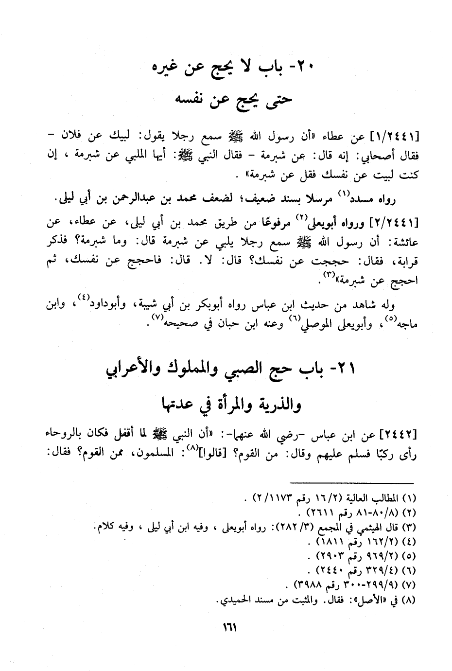 2441 / 1 - عَنْ عَطَاءٍ "أَنّ رَسُولَ اللَّهِ - صَلَّى اللَّهُ عَلَيْهِ وَسَلَّمَ - سَمِعَ رَجُلًا يَقُولُ: لَبَّيْكَ عَنْ فُلَانٍ- فَقَالَ أَصْحَابِي: إِنَّهُ قَالَ: عَنْ شُبْرُمَةَ- فَقَالَ النَّبِيُّ - صَلَّى اللَّهُ عَلَيْهِ وَسَلَّمَ -: أَيُّهَا الْمُلَبِّي عَنْ شُبْرُمَةَ، إِنْ كُنْتَ لَبَّيْتَ عَنْ نَفْسِكَ فَقُلْ عَنْ شُبْرُمَةَ".
