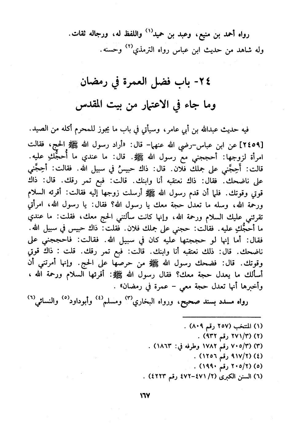 2459 - عَنِ ابْنِ عَبَّاسٍ- رَضِيَ اللَّهُ عَنْهُمَا- قَالَ: "أَرَادَ رَسُولُ اللَّهِ - صَلَّى اللَّهُ عَلَيْهِ وَسَلَّمَ - الْحَجَّ، فَقَالَتِ امْرَأَةٌ لِزَوْجِهَا: أَحْجِجْنِي مَعَ رَسُولِ اللَّهِ - صَلَّى اللَّهُ عَلَيْهِ وَسَلَّمَ - قال: ما عندي ما أُحجّكِ عليه. قالت: أَحِجَّني عَلَى جَمَلِكَ فُلَانٍ. قَالَ: ذَاكَ حبيسٌ فِي سبيل الله. فقالت: أحِجَّني عَلَى نَاضِحِكَ. فَقَالَ: ذَاكَ نَعْتَقِبُهُ أَنَا وَابْنُكِ. قَالَتْ: فَبِعْ تَمْرَ رِقِّكَ. قَالَ: ذَاكَ قُوتِي وَقُوتُكِ. فَلَمَّا أَنْ قَدِمَ رَسُولُ اللَّهِ - صَلَّى اللَّهُ عَلَيْهِ وَسَلَّمَ - أَرْسَلَتْ زَوْجَهَا إِلَيْهِ فَقَالَتْ: أَقْرِئْهُ السَّلَامَ وَرَحْمَةَ اللَّهِ، وَسَلْهُ مَا تَعْدِلُ حَجَّةً مَعَكَ يَا رَسُولَ اللَّهِ؟ فَقَالَ: يَا رسول الله، امْرَأَتِي تُقْرِئُنِي عَلَيْكَ السَّلَامَ وَرَحْمَةَ اللَّهِ، وَإِنَّهَا كَانَتْ سَأَلَتْنِي الْحَجَّ مَعَكَ، فَقُلْتُ: مَا عِنْدِي ما أحجُّكِ عليه. فقالت: حجني على جملك فلان. فقلت: ذاك حبيس في سبيل الله. فقال: أَمَا إِنَّهَا لَوْ حَجَجْتَهَا عَلَيْهِ كَانَ فِي سبيل الله. فقالت: فاحججني على ناضحك. قال: ذلك نَعْتَقِبُهُ أَنَا وَابْنُكِ. قَالَتْ: فَبِعْ تَمْرَ رِقِّكَ. قُلْتُ: ذَاكَ قُوتِي وَقُوتُكِ. قَالَ: فَضَحِكَ رَسُولُ اللَّهِ - صَلَّى اللَّهُ عَلَيْهِ وَسَلَّمَ - مِنْ حِرْصِهَا عَلَى الْحَجِّ. وَإِنَّهَا أَمَرَتْنِي أَنْ أَسْأَلَكَ مَا يَعْدِلُ حَجَّةً مَعَكَ؟ فَقَالَ رَسُولُ اللَّهِ - صَلَّى اللَّهُ عَلَيْهِ وَسَلَّمَ -: أَقْرِئْهَا السَّلَامَ وَرَحْمَةَ اللَّهِ، وَأَخْبِرْهَا أَنَّهَا تَعْدِلُ حَجَّةً مَعِي- عُمْرَةٌ فِي رَمَضَانَ ".