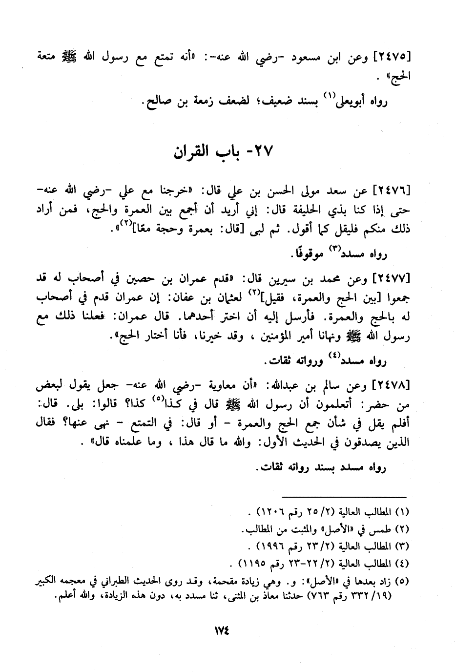 2476 - عَنْ سَعْدٍ مَوْلَى الْحَسَنِ بْنِ عَلِيٍّ قَالَ: "خَرَجْنَا مَعَ عَلِيٍّ- رَضِيَ اللَّهُ عَنْهُ- حَتَّى إذا كنا بِذِي الْحُلَيْفَةِ قَالَ: إِنِّي أُرِيدُ أَنْ أَجْمَعَ بَيْنَ الْعُمَرَةِ وَالْحَجِّ، فَمَنْ أَرَادَ ذَلِكَ مِنْكُمْ فليقل كما أقول. ثم لبى قال: بعمرة وحجة معًا، ".