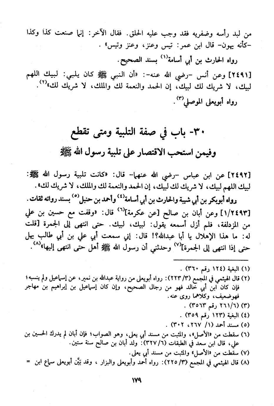 2492 - عن ابْنِ عَبَّاسٍ- رَضِيَ اللَّهُ عَنْهُمَا- قَالَ: "كَانَتْ تلبية رسول الله - صلى الله عليه وسلم -: لبيك اللهم لَبَّيْكَ، لَا شَرِيكَ لَكَ لَبَّيْكَ، إِنَّ الْحَمْدَ وَالنِّعْمَةَ لَكَ وَالْمُلْكَ، لَا شَرِيكَ لَكَ ". رَوَاهُ أَبُو بَكْرِ بْنُ أَبِي شَيْبَةَ وَالْحَارِثُ بْنُ أَبِي أِسَامَةَ وَأَحْمَدُ بْنُ حَنْبَلٍ بِسَنَدٍ رُوَاتُهُ ثقات.
