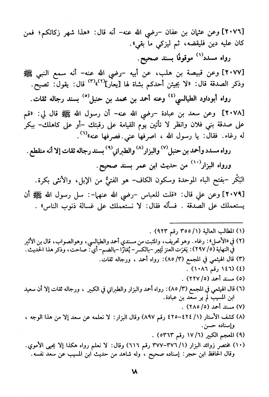 2077 - وعن قبيصة بْنِ هِلْبٍ، عَنْ أَبِيهِ- رَضِيَ اللَّهُ عَنْهُ- أَنَّهُ سَمِعَ النَّبِيَّ - صَلَّى اللَّهُ عَلَيْهِ وَسَلَّمَ - وَذَكَرَ الصَّدَقَةَ قَالَ: "لَا يَجِيئَنَّ أَحَدُكُمْ بِشَاةٍ لها يعار، قَالَ: يَقُولُ: تَصِيحُ. رَوَاهُ أَبُو دَاوُدَ الطَّيَالِسِيُّ وَعَنْهُ أَحْمَدُ بْنُ محمد بْنِ حَنْبَلٍ بِسَنَدٍ رِجَالُهُ ثِقَاتٌ.