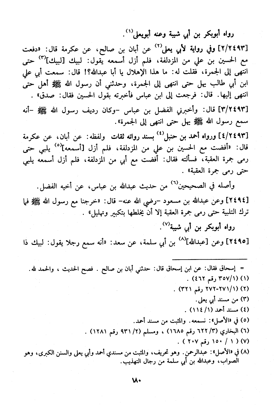 2493 / 4 - وَرَوَاهُ أَحْمَدُ بْنُ حَنْبَلٍ بِسَنَدٍ رُوَاتُهُ ثِقَاتٌ وَلَفْظُهُ: عَنْ أَبَانٍ، عَنْ عِكْرِمَةَ قَالَ: "أَفَضْتُ مَعَ الْحُسَيْنِ بْنِ عَلِيٍّ مِنَ الْمُزْدَلِفَةِ، فَلَمْ أَزَلْ أَسْمَعُهُ يُلَبِّي حَتَّى رَمَى جَمْرَةَ الْعَقَبَةِ، فَسَأَلْتُهُ فَقَالَ: أَفَضْتُ مَعَ أَبِي مِنَ الْمُزْدَلِفَةِ، فَلَمْ أَزَلْ أَسْمَعُهُ يُلَبِّي حَتَّى رَمَى جَمْرَةَ الْعَقَبَةِ".