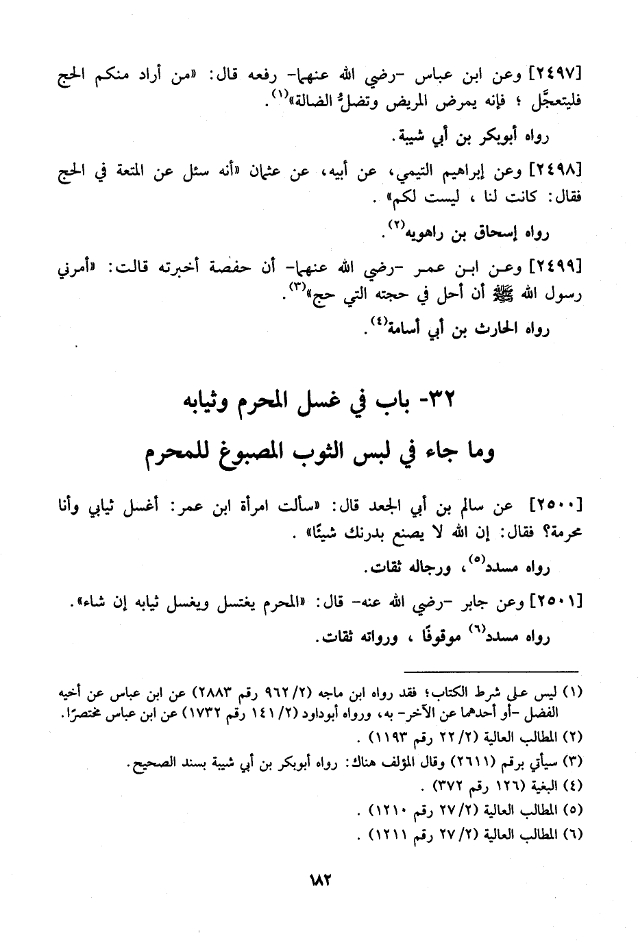 2501 - وَعَنْ جَابِرٍ- رَضِيَ اللَّهُ عَنْهُ- قَالَ: "الْمُحْرِمُ يَغْتَسِلُ وَيَغْسِلُ ثِيَابَهُ إِنْ شَاءَ". رَوَاهُ مُسَدَّدٌ مَوْقُوفًا، وَرُوَاتُهُ ثِقَاتٌ.