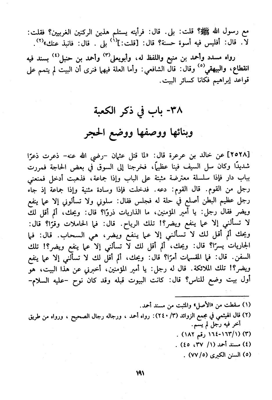 مَعَ رَسُولِ اللَّهِ - صَلَّى اللَّهُ عَلَيْهِ وَسَلَّمَ -؟ قُلْتُ: بَلَى. قَالَ: فَرَأَيْتُهُ يَسْتَلِمُ هَذَيْنِ الرُّكْنَيْنِ الْغَرْبِيَّيْنِ؟ فَقُلْتُ: لَا. قَالَ: أَفَلَيْسَ فِيهِ أُسْوَةٌ حسنة؟ قال: قُلْتُ: بَلَى. قَالَ: فَانْبِذْ عَنْكَ ". رَوَاهُ مُسَدَّدٌ وَأَحْمَدُ بْنُ مَنِيعٍ وَاللَّفْظُ لَهُ، وَأَبُو يَعْلَى وَأَحْمَدُ بْنُ حَنْبَلٍ بِسَنَدٍ فِيهِ انْقِطَاعٌ، وَالْبَيْهَقِيُّ وَقَالَ: قَالَ الشَّافِعِيُّ: وَأَمَّا الْعِلَّةُ فِيهِمَا فَنَرَى أَنَّ الْبَيْتَ لَمْ يُتَمَّمْ عَلَى قَوَاعِدِ إِبْرَاهِيمَ فَكَانَا كَسَائِرِ الْبَيْتِ.