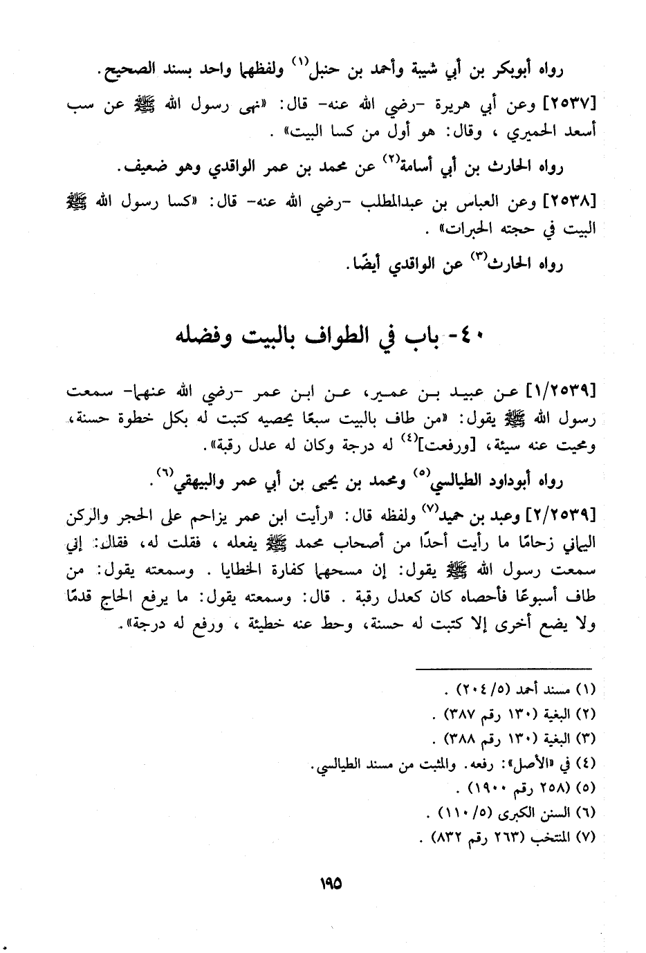 2539 / 1 - عَنْ عُبَيْدِ بْنِ عُمَيْرٍ، عَنْ ابْنَ عُمَرَ- رَضِيَ اللَّهُ عَنْهُمَا- سَمِعْتُ رَسُولَ اللَّهِ - صَلَّى اللَّهُ عَلَيْهِ وَسَلَّمَ - يَقُولُ: "مَنْ طَافَ بِالْبَيْتِ سبعًا يحصيه كُتِبَتْ لَهُ بِكُلِّ خُطْوةٍ حَسَنَةٌ، وَمُحِيَتْ عَنْهُ سيئة، ورفعت لَهُ دَرَجَةً وَكَانَ لَهُ عَدْلُ رَقَبَةٍ". رَوَاهُ أَبُو دَاوُدَ الطَّيَالِسِيُّ وَمُحَمَّدُ بْنُ يَحْيَى بْنِ أَبِي عُمَرَ وَالْبَيْهَقِيُّ.