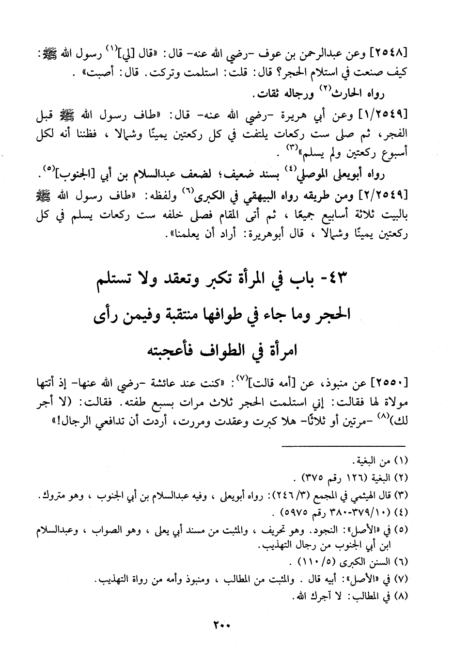 2550 - عن منبوذ، عن أمه قالت: "كُنْتُ عِنْدَ عَائِشَةَ- رَضِيَ اللَّهُ عَنْهَا- إِذْ أَتَتْهَا مَوْلَاةٌ لَهَا فَقَالَتْ: إِنِّي اسْتَلَمْتُ الْحَجَرَ ثَلَاثَ مَرَّاتٍ بِسَبْعٍ طُفْتُهُ. فَقَالَتْ: لَا أَجْرَ لَكَ -مَرَّتَيْنِ أَوْ ثَلَاثًا- هَلَّا كَبَّرْتِ وعقدت وَمَرَرْتِ، أَرَدْتِ أَنْ تُدَافِعِي الرِّجَالَ! "
