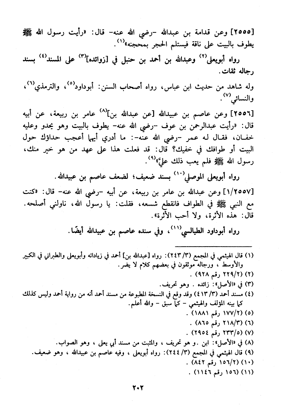 2556 - وَعَنْ عَاصِمِ بْنُ عُبَيْدِ اللَّهِ عَنْ عَبْدِ اللَّهِ بْنِ، عَامِرِ بْنِ رَبِيعَةَ، عَنْ أَبِيهِ قَالَ: "رَأَيْتُ عَبْدَ الرَّحْمَنِ بْنَ عَوْفٍ- رَضِيَ اللَّهُ عَنْهُ- يَطُوفُ بِالْبَيْتِ وَهُوَ يَحْدُو وَعَلَيْهِ خُفَّانِ، فَقَالَ لَهُ عُمَرُ- رَضِيَ اللَّهُ عَنْهُ-: مَا أَدْرِي أَيُّهُمَا أَعْجَبُ حِدَاؤُكَ حَوْلَ الْبَيْتِ أَوْ طَوَافُكَ فِي خُفَّيْكَ؟ قَالَ: قَدْ فَعَلْتُ هَذَا عَلَى عَهْدِ مَنْ هُوَ خَيْرٌ مِنْكَ، رَسُولِ اللَّهِ - صَلَّى اللَّهُ عَلَيْهِ وَسَلَّمَ - فَلَمْ حب ذَلِكَ عليَّ ". رَوَاهُ أَبُو يَعْلَى الْمُوصِلِيُّ بِسَنَدٍ ضَعِيفٍ، لِضَعْفِ عَاصِمِ بْنِ عُبَيْدِ اللَّهِ.