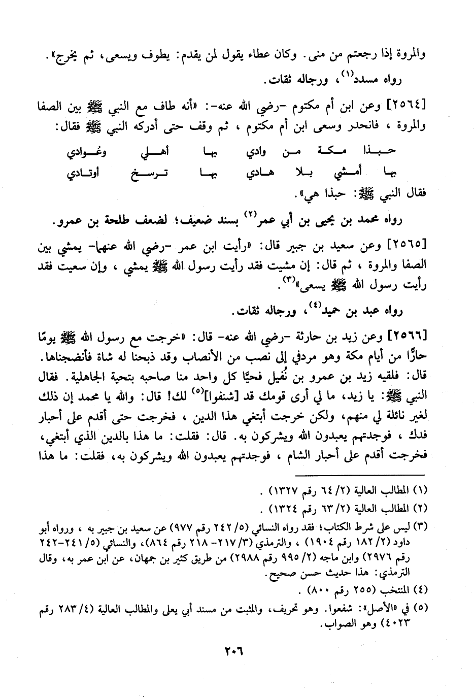 2566 - وعن زَيْدِ بْنِ حَارِثَةَ- رَضِيَ اللَّهُ عَنْهُ- قَالَ: "خَرَجْتُ مَعَ رَسُولِ اللَّهِ - صَلَّى اللَّهُ عَلَيْهِ وَسَلَّمَ - يَوْمًا حَارًّا مِنْ أَيَّامِ مَكَّةَ وَهُوَ مُرْدِفِي إِلَى نُصْبٍ مِنَ الْأَنْصَابِ وَقَدْ ذَبَحْنَا له شاة فأنضجناها. قال: فَلَقِيَهُ زَيْدُ بْنُ عَمْرِو بْنِ نُفيل فحيَّا كُلُّ وَاحِدٍ مِنَّا صَاحِبَهُ بِتَحِيَّةِ الْجَاهِلِيَّةِ. فَقَالَ النَّبِيُّ - صَلَّى اللَّهُ عَلَيْهِ وَسَلَّمَ -: يَا زَيْدُ، مَا لِي أَرَى قَوْمَكَ قَدْ شَنِفُوا لَكَ! قَالَ: وَاللَّهِ يَا مُحَمَّدُ إِنَّ ذَلِكَ لَغَيْرُ نَائِلَةٍ لِي مِنْهُمْ، وَلَكِنْ خَرَجْتُ أَبْتَغِي هَذَا الدين، فخرجت حتى أقدم على أحبار فدك، فَوَجَدْتُهُمْ يَعْبُدونَ اللَّهَ وَيُشْرِكُونَ بِهِ. قَالَ: فَقُلْتُ: ما هذا بالدين الذي أبتغي، فخرجت أقدم على أحبار الشام، فوجدتهم يعبدون الله ويشركون به، فَقُلْتُ: مَا هَذَا