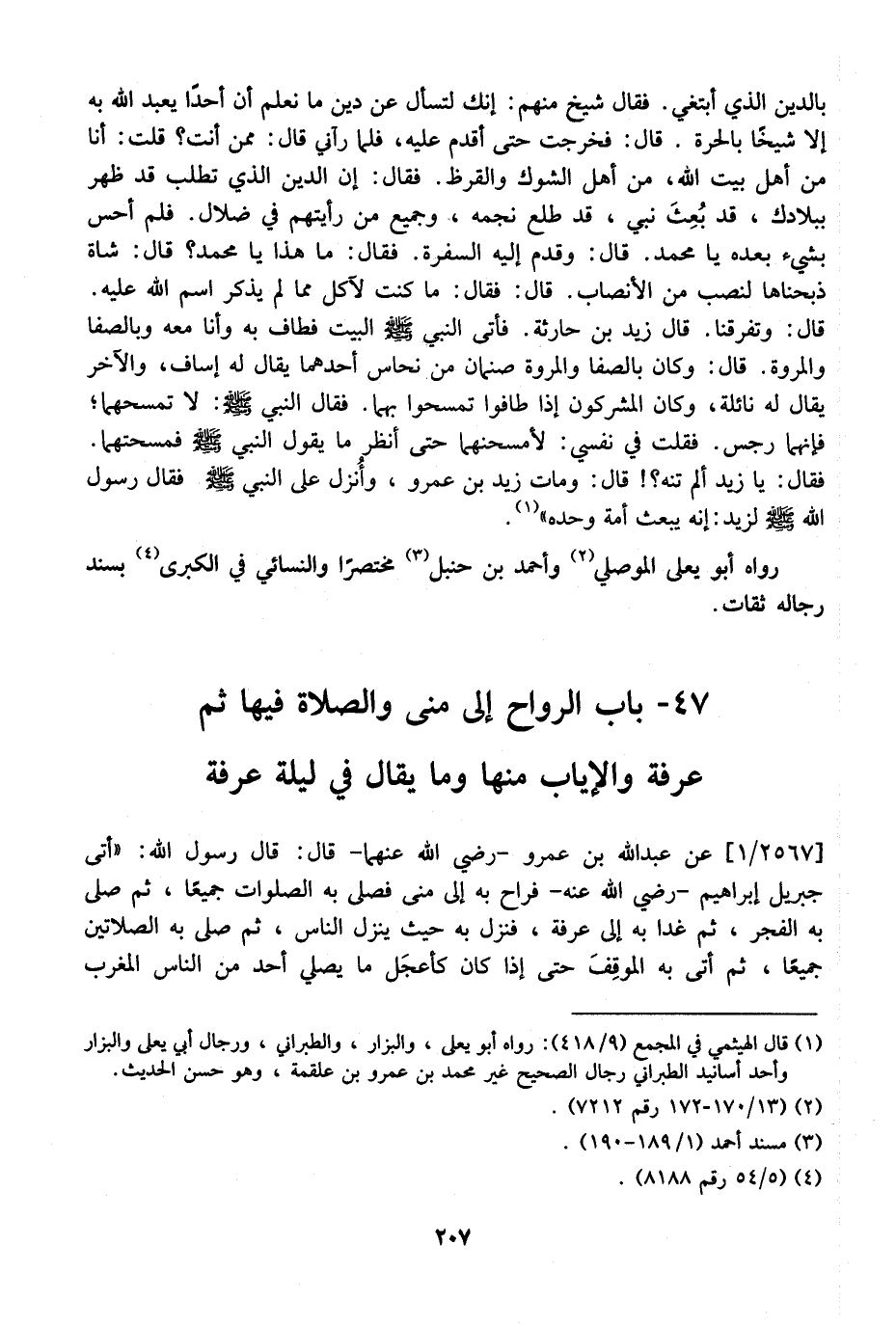 بِالدِّينِ الَّذِي أَبْتَغِي. فَقَالَ شَيْخٌ مِنْهُمْ: إِنَّكَ لَتَسْأَلُ عَنْ دِينٍ مَا نَعْلَمُ أَنَّ أَحَدًا يَعْبُدُ اللَّهَ بِهِ إِلَّا شَيْخًا بِالْحَرَّةِ. قَالَ: فَخَرَجْتُ حَتَّى أُقْدِمَ عَلَيْهِ، فَلَمَّا رَآنِي قَالَ: مِمَّنْ أَنْتَ؟ قُلْتُ: أَنَا مِنْ أَهْلِ بَيْتِ اللَّهِ، مِنْ أَهْلِ الشَّوْكِ وَالْقَرَظِ. فَقَالَ: إِنَّ الدِّينَ الَّذِي تَطْلُبُ قَدْ ظَهَرَ بِبِلَادِكَ، قَدْ بُعِثَ نَبِيٌّ، قَدْ طَلَعَ نَجْمُهُ، وَجَمِيعُ مِنْ رأيتهم في ضلال. فلم أحس بِشَيْءٍ بَعْدَهُ يَا مُحَمَّدُ. قَالَ: وَقَدَّمَ إِلَيْهِ السُّفْرَةَ. فَقَالَ: مَا هَذَا يَا مُحَمَّدُ؟ قَالَ: شَاةٌ ذَبَحْنَاهَا لِنُصْبٍ مِنَ الْأَنْصَابِ. قَالَ: فَقَالَ: مَا كُنْتُ لِآكُلُ مِمَّا لَمْ يُذْكَرِ اسْمُ اللَّهِ عَلَيْهِ. قَالَ: وَتَفَرَّقْنَا. قَالَ زَيْدُ بْنُ حَارِثَةَ. فَأَتَى النَّبِيُّ - صَلَّى اللَّهُ عَلَيْهِ وَسَلَّمَ - الْبَيْتَ فَطَافَ بِهِ وَأَنَا مَعَهُ وَبِالصَّفَا وَالْمَرْوَةِ. قَالَ: وَكَانَ بِالصَّفَا وَالْمَرْوَةِ صَنَمَانِ مِنْ نُحَاسٍ أَحَدُهُمَا يُقَالُ لَهُ إِسَافُ، وَالْآخَرُ يُقَالُ لَهُ نَائِلَةُ، وَكَانَ الْمُشْرِكُونَ إِذَا طَافُوا تَمَسَّحُوا بِهِمَا. فَقَالَ النَّبِيُّ - صَلَّى اللَّهُ عَلَيْهِ وَسَلَّمَ -: لَا تَمْسَحْهُمَا، فَإِنَّهُمَا رِجْسٌ. فَقُلْتُ فِي نَفْسِي: لِأَمْسَحَنَّهُمَا حَتَّى أَنْظُرَ مَا يَقُولُ النَّبِيُّ - صَلَّى اللَّهُ عَلَيْهِ وَسَلَّمَ - فَمَسَحْتُهُمَا. فَقَالَ: يَا زَيْدُ أَلَمْ تنه؟! قال: ومات زيد بن عمرو، وأنزلت عَلَى النَّبِيِّ - صَلَّى اللَّهُ عَلَيْهِ وَسَلَّمَ - فَقَالَ رَسُولُ اللَّهِ - صَلَّى اللَّهُ عَلَيْهِ وَسَلَّمَ - فِيهِ لِزَيْدٍ: إِنَّهُ يُبْعَثُ أُمَّةً وَحْدَهُ ".