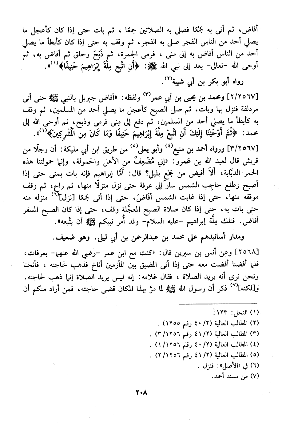 2567 / 3 - وَرَوَاهُ أَحْمَدُ بْنُ مَنِيعٍ وَأَبُو يَعْلَى مِنْ طَرِيقِ ابْنِ أَبِي مُلَيْكَةَ: أَنَّ رَجُلًا مِنْ قُرَيْشٍ قَالَ لِعَبْدِ اللَّهِ بْنِ عَمرو: "إِنِّي مُضْعِفٌ مِنَ الْأَهْلِ وَالْحُمُولَةِ، وَإِنَّمَا حُمَولَتُنَا هَذِهِ الْحُمُرُ الدبَّابة، أَلاَ أَفِيضُ مِنْ جَمع بِلَيْلٍ؟ قَالَ: أَمَّا إِبْرَاهِيمُ فَإِنَّهُ بَاتَ بِمِنًى حَتَّى إِذَا أَصْبَحَ وَطَلَعَ حاجِب الشَّمْسِ سَارَ إِلَى عرفة حتى نزل مَنْزِلًا مِنْهَا، ثُمَّ رَاحَ، ثُمَّ وَقَفَ مَوْقِفَهُ مِنْهَا، حَتَّى إِذَا غَابَتِ الشَّمْسُ أفَاضَ، حَتَّى إذا أتى جَمعًا نزل مَنْزِلَهُ مِنْهُ حَتَّى بَاتَ بِهِ، حَتَّى إِذَا كَانَ صَلَاةُ الصُّبْحِ المعجَّلة وَقَفَ، حَتَّى إِذَا كَانَ الصُّبْحُ الْمُسْفِرُ أَفَاضَ. فَتِلْكَ مِلَّة إِبْرَاهِيمَ- عَلَيْهِ السَّلَامُ- وَقَدْ أُمر نِبِيُّكُمْ - صَلَّى اللَّهُ عَلَيْهِ وَسَلَّمَ - أَنْ يتَّبعه ". وَمَدَارُ أَسَانِيدِهِمْ عَلَى مُحَمَّدِ بْنِ عَبْدِ الرَّحْمَنِ بْنِ أَبِي لَيْلَى، وَهُوَ ضَعِيفٌ.