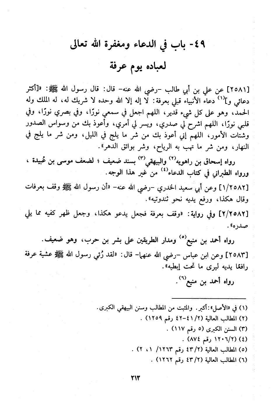 2581 - عَنْ عَلِيِّ بْنِ أَبِي طَالِبٍ- رَضِيَ اللَّهُ عَنْهُ- قَالَ: قَالَ رَسُولُ اللَّهِ - صَلَّى اللَّهُ عَلَيْهِ وَسَلَّمَ -: " أَكْثَرُ دُعَائِي وَدُعَاءُ الْأَنْبِيَاءِ قَبْلِي بِعَرَفَةَ: لَا إِلَهَ إِلَّا اللَّهُ وَحْدَهُ لَا شَرِيكَ لَهُ، لَهُ الْمُلْكُ وَلَهُ الْحَمْدُ، وَهُوَ عَلَى كُلِّ شَيْءٍ قَدِيرٌ، اللَّهُمَّ اجْعَلْ فِي سَمْعِي نُورًا، وَفِي بَصَرِي نُورًا، وَفِي قَلْبِي نُورًا، اللَّهُمَّ اشْرَحْ لِي صَدْرِي، وَيَسِرْ لِي أَمْرِي، وَأَعُوذُ بِكَ مِنْ وُسْوَاسِ الصدور وشتات الأمور، اللَّهُمَّ إِنِّي أَعُوذُ بِكَ مِنْ شَرِّ مَا يَلِجُ فِي اللَّيْلِ، وَمِنْ شَرِّ مَا يَلِجُ فِي النَّهَارِ، وَمِنْ شَرِّ مَا تَهُبُّ بِهِ الرِّيَاحُ، وَشَرِّ بَوائِقِ الدَّهْرِ". رَوَاهُ إِسْحَاقُ بْنُ رَاهَوَيْهِ وَالْبَيْهَقِيُّ بِسَنَدٍ ضَعِيفٍ، لِضَعْفِ مُوسَى بْنِ عُبيدة، وَرَوَاهُ الطَّبَرَانِيُّ فِي كِتَابِ الدُّعَاءِ مِنْ غَيْرِ هَذَا الْوَجْهِ.