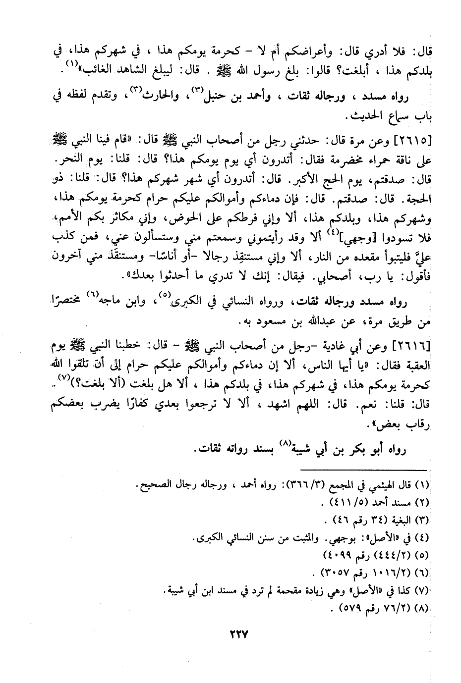 2615 - وَعَنْ مُرَّةَ قَالَ: حَدَّثَنِي رَجُلٍ مِنْ أَصْحَابِ النَّبِيِّ - صَلَّى اللَّهُ عَلَيْهِ وَسَلَّمَ - قَالَ: "قَامَ فِينَا النَّبِيُّ - صَلَّى اللَّهُ عَلَيْهِ وَسَلَّمَ - عَلَى نَاقَةٍ حَمْرَاءَ مُخَضْرَمَةٍ فَقَالَ: أَتَدْرُونَ أَيُّ يَوْمٍ يَوْمَكُمْ هَذَا؟ قال: قُلْنَا: يَوْمُ النَّحْرِ. قَالَ: صَدَقْتُمْ، يَوْمُ الْحَجِّ الْأَكْبَرِ. قَالَ: أَتَدْرُونَ أَيُّ شَهْرٍ شَهْرَكُمْ هَذَا؟ قَالَ: قُلْنَا: ذُو الْحِجَّةِ. قَالَ: صَدَقْتُمْ. قَالَ: فَإِنَّ دِمَاءَكُمْ وَأَمْوَالَكُمْ عَلَيْكُمْ حَرَامٌ كُحُرْمَةِ يَوْمِكُمْ هذا، وشهركم هَذَا، وَبَلَدِكُمْ هَذَا، أَلَا وَإِنِّي فَرَطُكُمْ عَلَى الْحَوْضِ، وَإِنِّي مُكَاثِرٌ بِكُمُ الْأُمَمَ، فَلَا تُسَوِّدُوا وجهي أَلَا وَقَدْ رَأَيْتُمُونِي وَسَمِعْتُمْ مِنِّي وَسَتُسْأَلُونَ عَنِّي، فَمَنْ كَذَبَ عليَّ فَلْيَتَبَوَّأْ مَقْعَدَهُ مِنَ النَّارِ، ألا وإني مستنقِذ رجالا- أو أناسا- ومستنقَذ مِنِّي آخَرُونَ فَأَقُولُ: يَا رِبِّ، أَصْحَابِي. فَيُقَالُ: إِنَّكَ لَا تَدْرِي مَا أَحْدَثُوا بَعْدَكَ ". رَوَاهُ مُسَدَّدٌ وَرِجَالُهُ ثِقَاتٌ، وَرَوَاهُ النَّسَائِيُّ فِي الْكُبْرَى، وَابْنُ مَاجَهْ مُخْتَصَرًا مِنْ طَرِيقِ مُرَّةَ، عن عبد الله بن مسعود به.