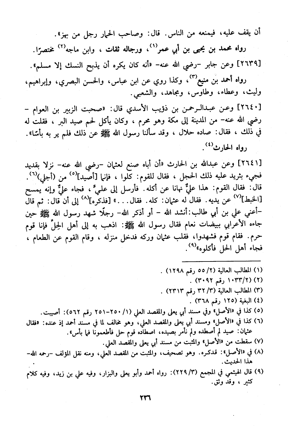 2641 - وَعَنْ عَبْدِ اللَّهِ بْنِ الْحَارِثِ "أَنَّ أَبَاهُ صَنَعَ لِعُثْمَانَ- رَضِيَ اللَّهُ عَنْهُ- نُزُلًا بِقَدِيدٍ فجيء بِثَرِيدٍ عَلَيْهِ ذَلِكَ الْحَجَلِ، فَقَالَ لِلْقَوْمِ: كُلُوا، فَإِنَّمَا أُصِيدَ مِنْ (أَجْلِي) . قَالَ: فَقَالَ الْقَوْمُ: هذا عليّ نهانا عَنْ أَكْلِهِ. فَأَرْسَلَ إِلَى عَلِيٍّ، فَجَاءَ عَلِيٌّ وَأَنَّهُ يَمْسَحُ الْخَبَطَ عَنْ يَدَيْهِ. فَقَالَ لَهُ عثمان: كله. فقال ... " فذكره إِلَى أَنْ قَالَ: ثُمَّ قَالَ - أَعْنِي عَلِيَّ بْنَ أَبِي طَالِبٍ: أُنْشِدُ اللَّهَ- أَوْ أَذْكُرُ اللَّهَ- رَجُلًا شَهِدَ رَسُولَ اللَّهِ - صَلَّى اللَّهُ عَلَيْهِ وَسَلَّمَ - حِينَ جَاءَهُ الْأَعْرَابِيُّ بِبَيْضَاتِ نَعَامٍ فَقَالَ رَسُولُ اللَّهِ - صَلَّى اللَّهُ عَلَيْهِ وَسَلَّمَ -: اذْهَبْ بِهِ إِلَى أَهْلِ الحِلِّ فَإِنَّا قَوْمٌ حُرُمٌ. فَقَامَ قَوْمٌ فَشَهِدُوا، فَقَلَبَ عُثْمَانُ وَرِكَهُ فَدَخَلَ مَنْزِلَهُ، وَقَامَ الْقَوْمُ عَنِ الطَّعَامِ، فَجَاءَ أَهْلُ الْحِلِّ فَأَكَلُوهُ ".
