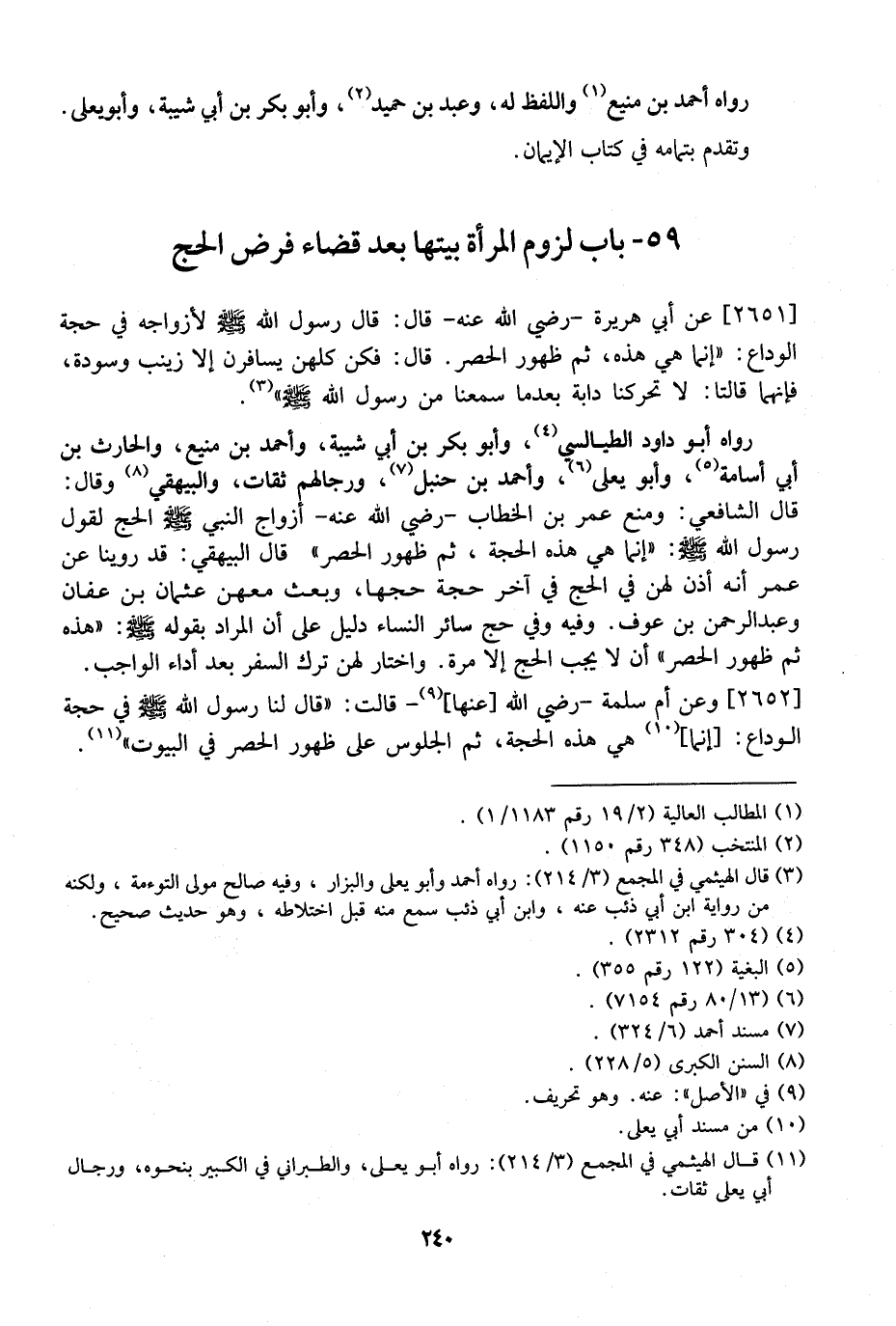 رَوَاهُ أَبُو دَاوُدَ الطَّيَالِسِيُّ، وَأَبُو بَكْرِ بْنُ أَبِي شَيْبَةَ، وَأَحْمَدُ بْنُ مَنِيعٍ، وَالْحَارِثُ بْنُ أَبِي أُسَامَةَ، وَأَبُو يَعْلَى، وَأَحْمَدُ بْنُ حَنْبَلٍ، وَرِجَالُهُمْ ثِقَاتٌ، وَالْبَيْهَقِيُّ وَقَالَ: قَالَ الشَّافِعِيُّ: وَمَنَعَ عُمَرُ بْنُ الْخَطَّابِ- رَضِيَ اللَّهُ عَنْهُ- أَزْوَاجَ النَّبِيِّ - صَلَّى اللَّهُ عليه وسلم - الحج لقول رسول الله: "إنما هي هذه الحجة، ثُمَّ ظُهُورُ الْحُصُرِ" قَالَ الْبَيْهَقِيُّ: قَدْ رَوَيْنَا عَنْ عُمَرَ أَنَّهُ أَذِنَ لَهُنَّ فِي الْحَجِّ فِي آخِرِ حَجَّةٍ حَجَّهَا، وَبَعَثَ مَعَهُنَّ عُثْمَانَ بْنَ عَفَّانَ وَعَبْدَ الرَّحْمَنِ بْنَ عَوْفٍ. وَفِيهِ وَفِي حَجِّ سَائِرِ النِّسَاءِ دَلِيلٌ عَلَى أَنَّ المراد بقوله: "هذه ثم ظهور الحصر" أن لَا يَجِبُ الْحَجُّ إِلَّا مَرَّةً. وَاخْتَارَ لَهُنَّ تَرْكَ السَّفَرِ بَعْدَ أَدَاءِ الْوَاجِبِ.