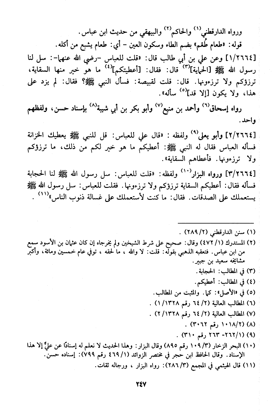 2664 / 1 - وَعَنْ عَلِيِّ بْنِ أَبِي طَالِبٍ قَالَ: "قُلْتُ لِلْعَبَّاسِ- رَضِيَ اللَّهُ عَنْهُمَا-: سَلْ لَنَا رَسُولُ اللَّهِ - صَلَّى اللَّهُ عَلَيْهِ وَسَلَّمَ - الْحِمَايَةَ قَالَ: فَقَالَ: أَعْطَيْتُكُمْ مَا هو خير منها السقاية، ترزؤكم وَلَا تَرْزَءوُنَهَا. قَالَ: قُلْتُ لِقَبِيصَةَ: فَسَأَلَ النَّبِيَّ - صَلَّى اللَّهُ عَلَيْهِ وَسَلَّمَ - فَقَالَ: لَمْ يَزِدْ على هذا، ولا يكونإلا قَدْ، سَأَلَهُ ".