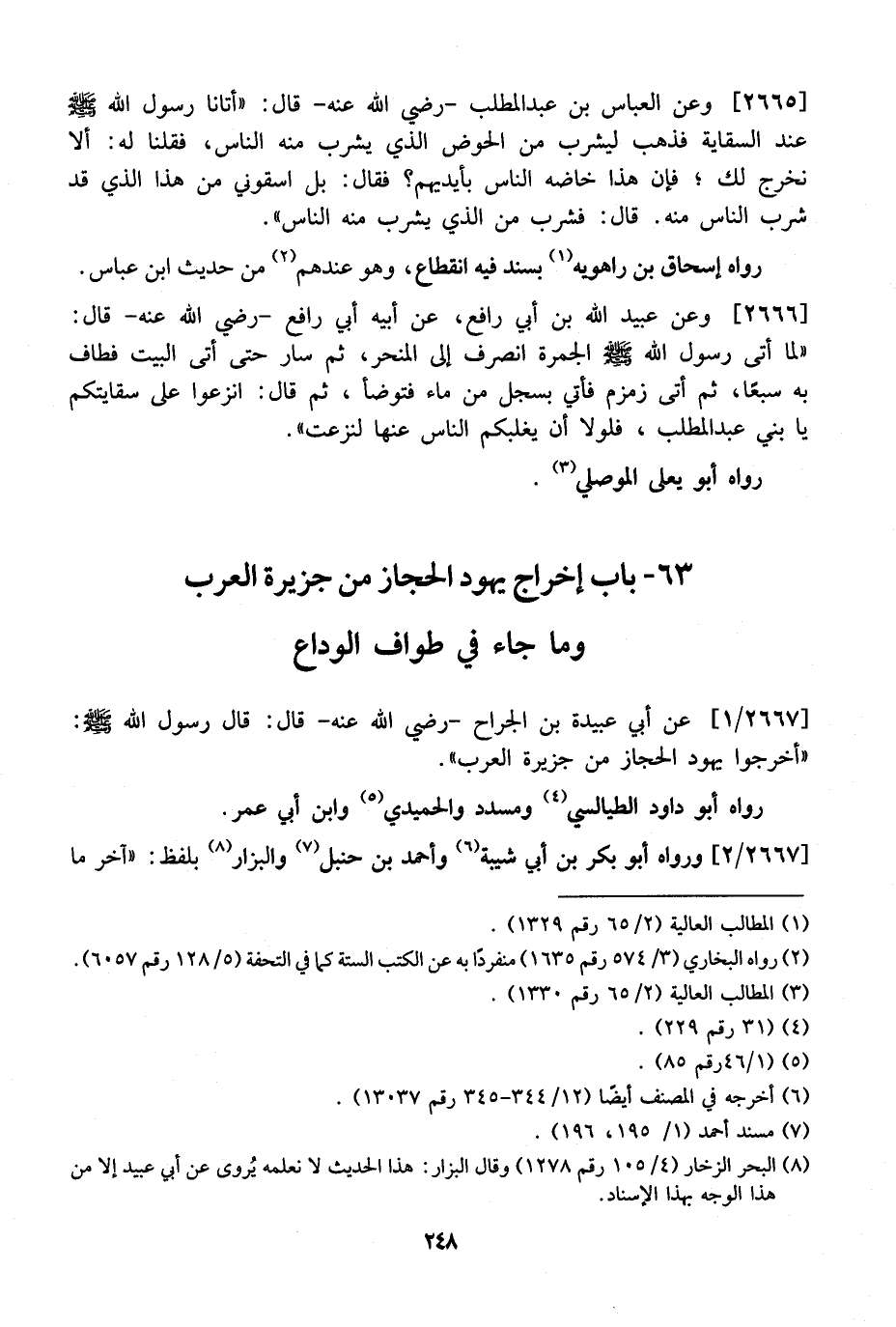 2667 / 1 - عَنْ أَبِي عُبَيْدَةَ بْنِ الْجَرَّاحِ- رَضِيَ اللَّهُ عَنْهُ- قَالَ: قَالَ رَسُولُ اللَّهِ - صَلَّى اللَّهُ عَلَيْهِ وَسَلَّمَ -: "أَخْرِجُوا يَهُودَ الْحِجَازِ مِنْ جَزِيرَةِ الْعَرَبِ ".