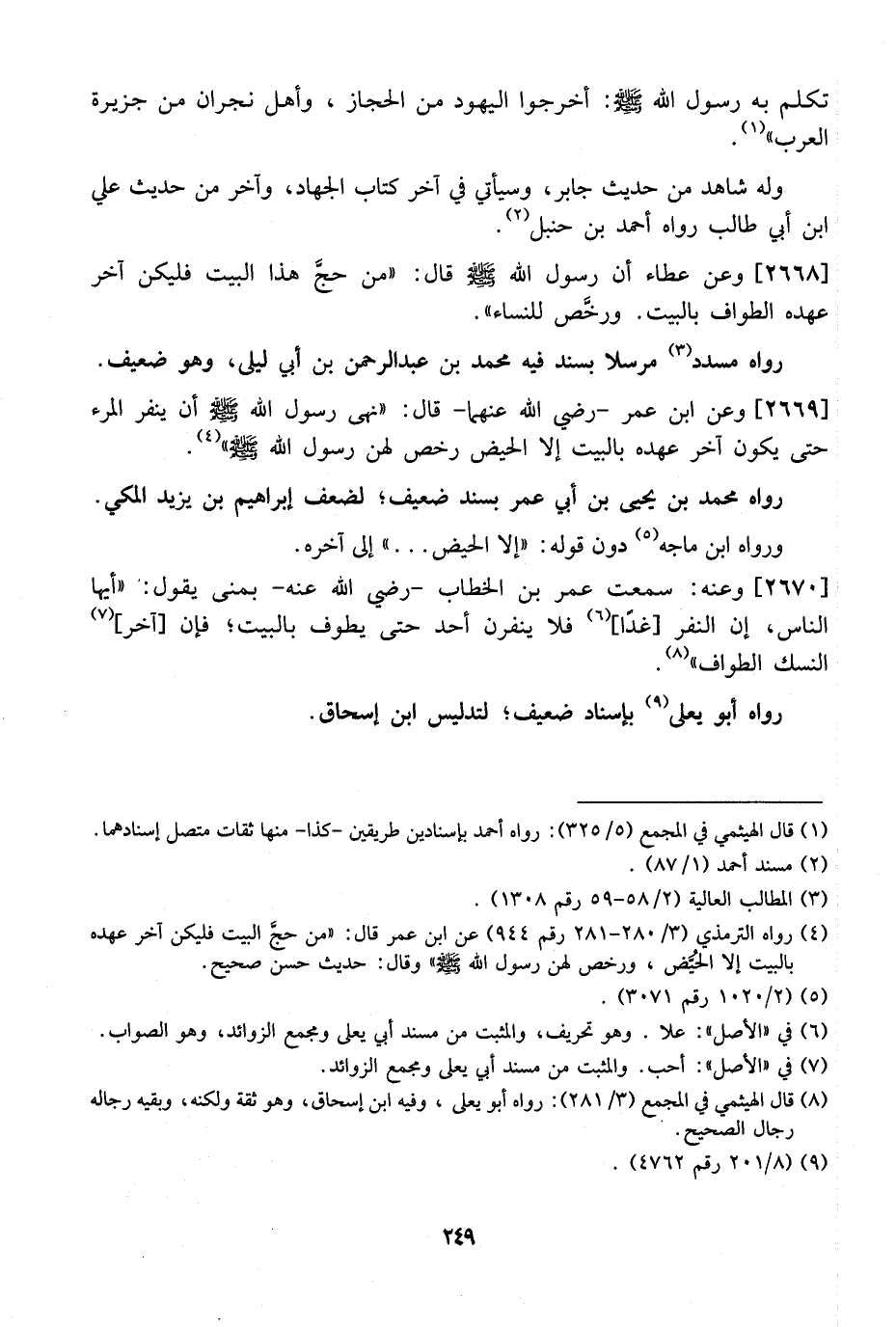 2669 - وعَنِ ابْنِ عُمَرَ- رَضِيَ اللَّهُ عَنْهُمَا- قَالَ: "نَهَى رَسُولُ اللَّهِ - صَلَّى اللَّهُ عَلَيْهِ وَسَلَّمَ - أَنْ يَنْفِرَ الْمَرْءُ حَتَّى يكون آخر عهده بِالْبَيْتِ إِلَّا الْحُيَّضُ رَخَصَّ لَهُنَّ رَسُولُ اللَّهِ - صَلَّى اللَّهُ عَلَيْهِ وَسَلَّمَ -".