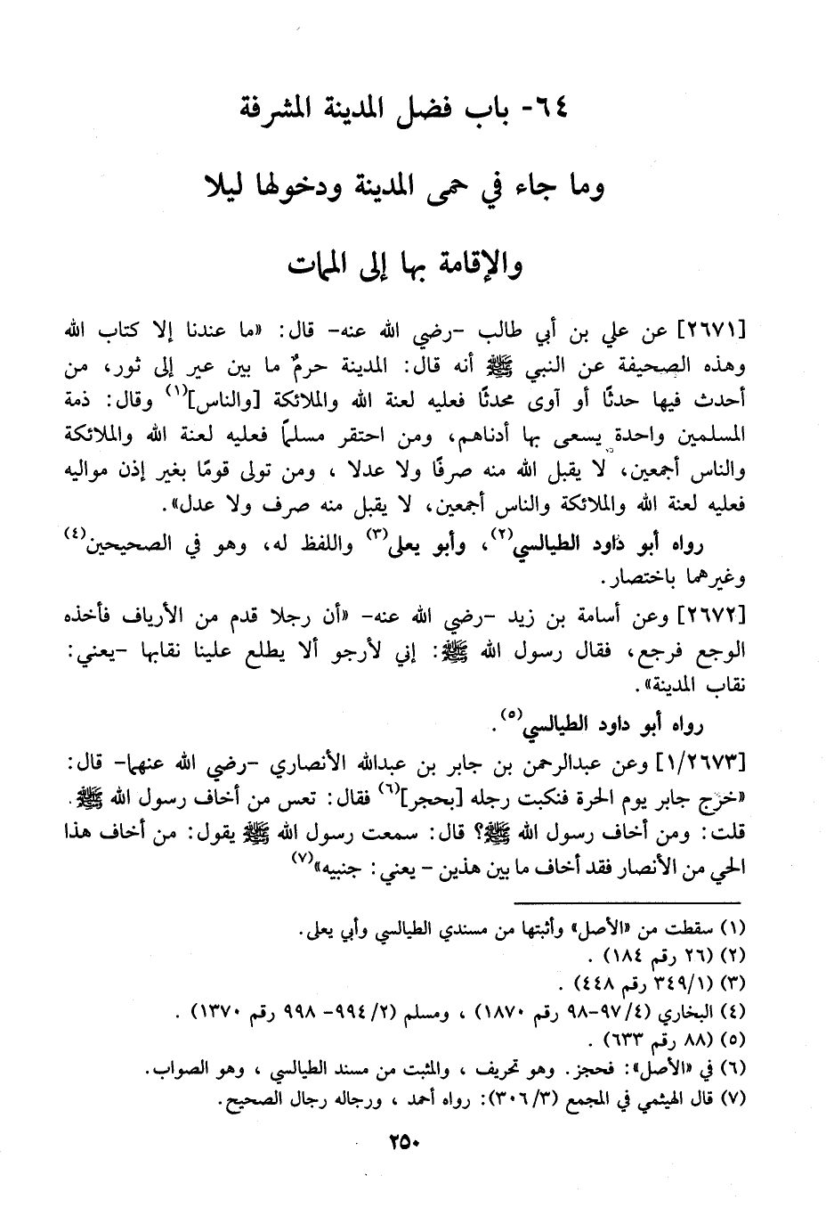 2671 - عَنْ عَلِيِّ بْنِ أَبِي طَالِبٍ- رَضِيَ اللَّهُ عَنْهُ- قَالَ: "مَا عِنْدَنَا إِلَّا كِتَابُ اللَّهِ وَهَذِهِ الصَّحِيفَةُ عَنِ النَّبِيِّ - صَلَّى اللَّهُ عَلَيْهِ وَسَلَّمَ - أَنَّهُ قَالَ: الْمَدِينَةُ حرمٌ مَا بَيْنَ عِيرَ إِلَى ثَوْرَ، مَنْ أَحْدَثَ فِيهَا حَدَثًا أَوْ آوَى مُحْدِثًا فَعَلَيْهِ لَعْنَةُ اللَّهِ والملائكة والناس، وقال: ذِمَّةُ الْمُسْلِمِينَ وَاحِدَةٌ يَسْعَى بِهَا أَدْنَاهُمْ، وَمَنِ احْتَقَرَ مُسْلِمًا فَعَلَيْهِ لَعْنَةُ اللَّهِ وَالْمَلَائِكَةِ وَالنَّاسِ أَجْمَعِينَ، لَا يَقْبَلُ اللَّهُ مِنْهُ صَرْفًا وَلَا عَدْلًا، وَمَنْ تَوَّلَى قَوْمًا بِغَيْرِ إِذْنِ مَوَالِيهِ فَعَلَيْهِ لَعْنَةُ اللَّهِ وَالْمَلَائِكَةِ وَالنَّاسِ أَجْمَعِينَ، لَا يُقْبَلُ مِنْهُ صَرْفٌ وَلَا عَدْلٌ ".
