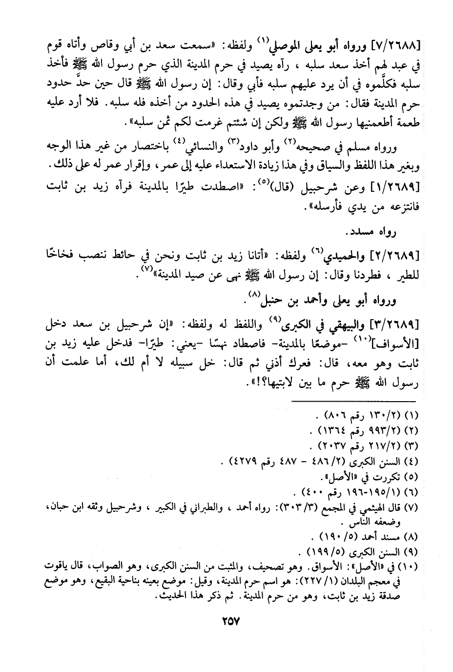 2689 / 3 - وَالْبَيْهَقِيُّ فِي الْكُبْرَى وَاللَّفْظُ لَهُ وَلَفْظُهُ: "أَنَّ شُرَحْبِيلَ بن سعد دخل الأسواف - مُوضِعًا بِالْمَدِينَةِ- فَاصْطَادَ نَهْسًا- يَعْنِي: طَيْرًا- فَدَخَلَ عَلَيْهِ زَيْدُ بْنُ ثَابِتٍ وَهُوَ مَعَهُ، قَالَ: فَعَرَكَ أُذُنِي ثُمَّ قَالَ: خَلِّ سَبِيلَهُ لَا أُمَّ لَكَ، أَمَا عَلِمْتَ أَنَّ رَسُولَ اللَّهِ - صَلَّى اللَّهُ عَلَيْهِ وَسَلَّمَ - حَرَّمَ مَا بَيْنَ لابتيها؟! ".