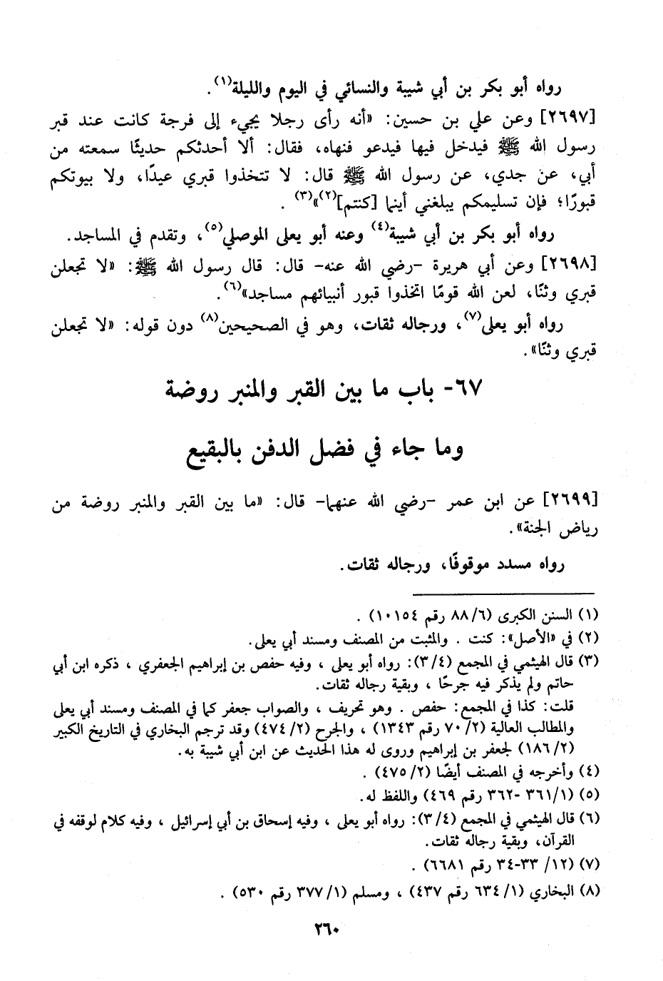 2699 - عَنِ ابْنِ عُمَرَ- رَضِيَ اللَّهُ عَنْهُمَا- قَالَ: "مَا بَيْنَ الْقَبْرِ وَالْمِنْبَرِ رَوْضَةٌ مِنْ رِيَاضِ الْجَنَّةِ". رَوَاهُ مُسَدَّدٌ مَوْقُوفًا، وَرِجَالُهُ ثِقَاتٌ.
