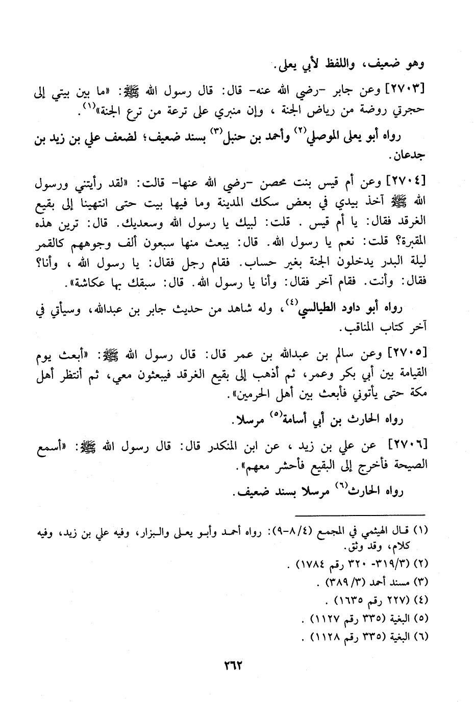 2706 - عَنْ عَلِيِّ بْنِ زَيْدٍ، عَنِ ابْنِ الْمُنْكَدِرِ قَالَ: قَالَ رَسُولُ اللَّهِ - صَلَّى اللَّهُ عَلَيْهِ وَسَلَّمَ -: "أَسْمَعُ الصَّيْحَةَ فَأَخْرُجُ إِلَى الْبَقِيعِ فَأُحْشَرُ مَعَهُمْ ".