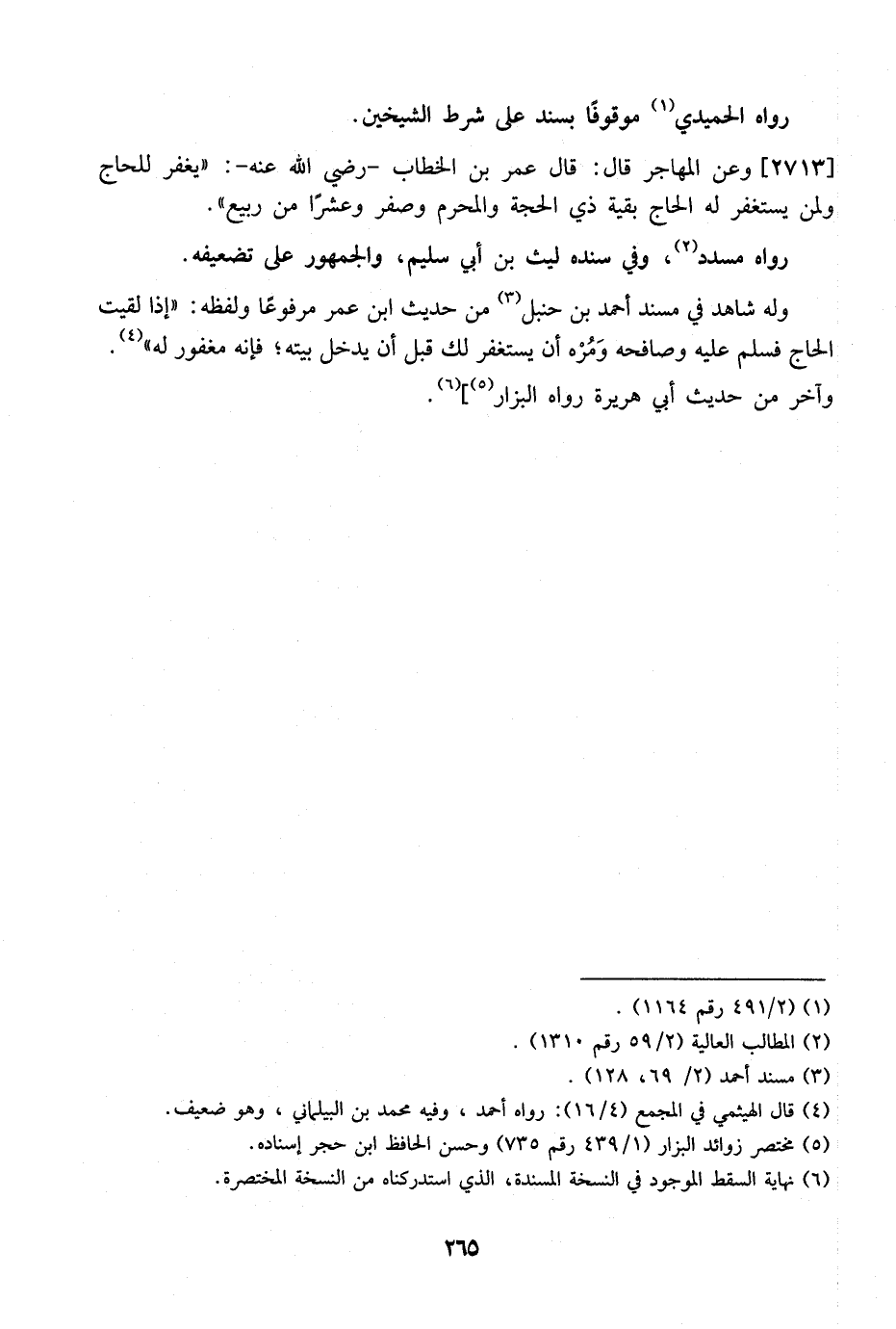 وَلَهُ شَاهِدٌ فِي مُسْنَدِ أَحْمَدَ بْنِ حَنْبَلٍ مِنْ حَدِيثِ ابْنِ عُمَرَ مَرْفُوعًا وَلَفْظُهُ: "إِذَا لَقِيتَ الْحَاجَّ فَسَلِّمْ عَلَيْهِ وَصَافِحْهُ وَمُرْه أَنْ يَسْتَغْفِرْ لَكَ قَبْلَ أَنْ يَدْخُلَ بَيْتَهُ؛ فَإِنَّهُ مَغْفُورٌ لَهُ ". وَآخَرُ مِنْ حَدِيثِ أَبِي هُرَيْرَةَ رواه البزار.