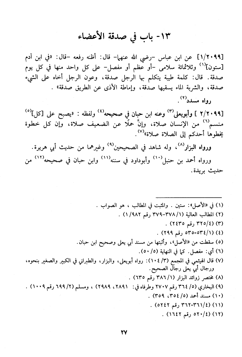 2099 / 1 - عَنِ ابْنِ عَبَّاسٍ- رَضِيَ اللَّهُ عَنْهُمَا- قَالَ: أَظُنُّهُ رَفَعَهُ- قَالَ: "فِي ابْنِ آدَمَ سِتُّونَ، وثلاثمائة سلامى- أو عظم أَوْ مِفْصَلٍ- عَلَى كُلِّ وَاحِدٍ مِنْهَا فِي كُلِّ يَوْمٍ صَدَقَةٌ. قَالَ: كَلِمَةٌ طَيِّبَةٌ يَتَكَلَّمُ بِهَا الرَّجُلُ صَدَقَةٌ، وَعَوْنُ الرَّجُلِ أَخَاهُ عَلَى الشَّيْءِ صَدَقَةٌ، وَالشَّرْبَةُ الْمَاءَ يَسْقِيهَا صَدَقَةٌ، وَإِمَاطَةُ الْأَذَى عَنِ الطَّرِيقِ صَدَقَةٌ". رَوَاهُ مُسَدَّدٌ.