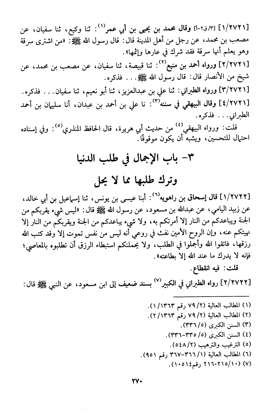 2722 / 1 - قال إسحاق بن راهويه: أبنا عِيسَى بْنُ يُونُسَ، ثَنَا إِسْمَاعِيلُ بْنُ أَبِي خَالِدٍ، عَنْ زُبَيْدٍ الْيَامِيِّ، عْنَ عَبْدِ اللَّهِ بْنِ مَسْعُودٍ، عَنْ رَسُولِ اللَّهِ - صَلَّى اللَّهُ عَلَيْهِ وَسَلَّمَ - قَالَ: "لَيْسَ شَيْءٌ يُقَرِّبُكُمْ مِنَ الْجَنَّةِ وَيُبَاعِدُكُمْ مِنَ النَّارِ إِلَّا أَمَرْتُكُمْ بِهِ، وَلَا شَيْءٌ يُبَاعِدُكُمْ مِنَ الْجَنَّةِ وَيُقَرِّبُكُمْ مِنَ النَّارِ إِلَّا نَهَيْتُكُمْ عَنْهُ، وَإِنَّ الرُّوحَ الْأَمِينَ نَفَثَ فِي رُوعِي أَنَّهُ لَيْسَ مِنْ نَفْسٍ تَمُوتُ إِلَّا وَقَدْ كَتَبَ اللَّهُ رِزْقَهَا، فَاتَّقُوا اللَّهَ وَأَجْمِلُوا فِي الطَّلَبِ، وَلَا يَحْمِلَنَّكُمُ اسْتِبْطَاءُ الرِّزْقِ أَنْ تَطْلُبُوهُ بِالْمَعَاصِي؛ فَإِنَّهُ لَا يُدْرَكُ مَا عِنْدَ اللَّهِ إِلَّا بِطَاعَتِهِ ". قُلْتُ: فِيهِ انْقِطَاعٌ.