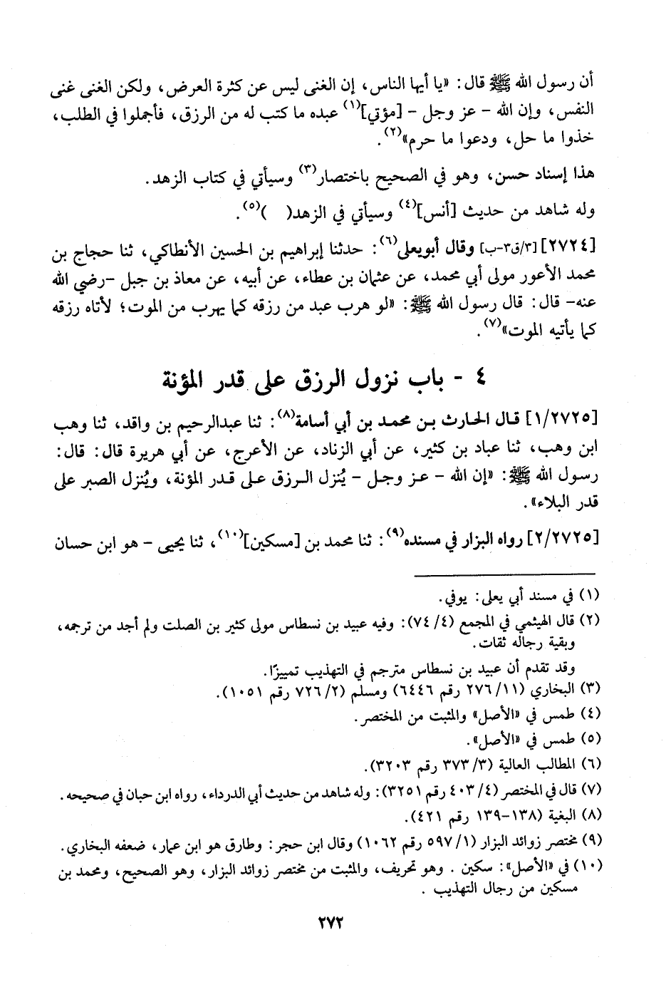 أن رسول الله - صلى الله عليه وسلم - قال: "يا أيها الناس، إن الغنى ليس عن كَثْرَةِ الْعَرَضِ، وَلِكِنَّ الْغِنَى غِنَى النَّفْسِ، وَإِنَّ الله- عز وجل- مؤتي عبده ما كتب له من الرزق، فَأَجْمِلُوا فِي الطَّلَبِ، خُذُوا مَا حَلَّ، وَدَعُوا مَا حُرِّمَ ". هَذَا إِسْنَادٌ حَسَنٌ، وَهُوَ فِي الصَّحِيحِ بِاخْتِصَارٍ وَسَيَأْتِي فِي كِتَابِ الزُّهْدِ. وَلَهُ شَاهِدٌ مِنْ حَدِيثِ أَنَسٍ، وَسَيَأْتِي فِي الزُّهْدِ.