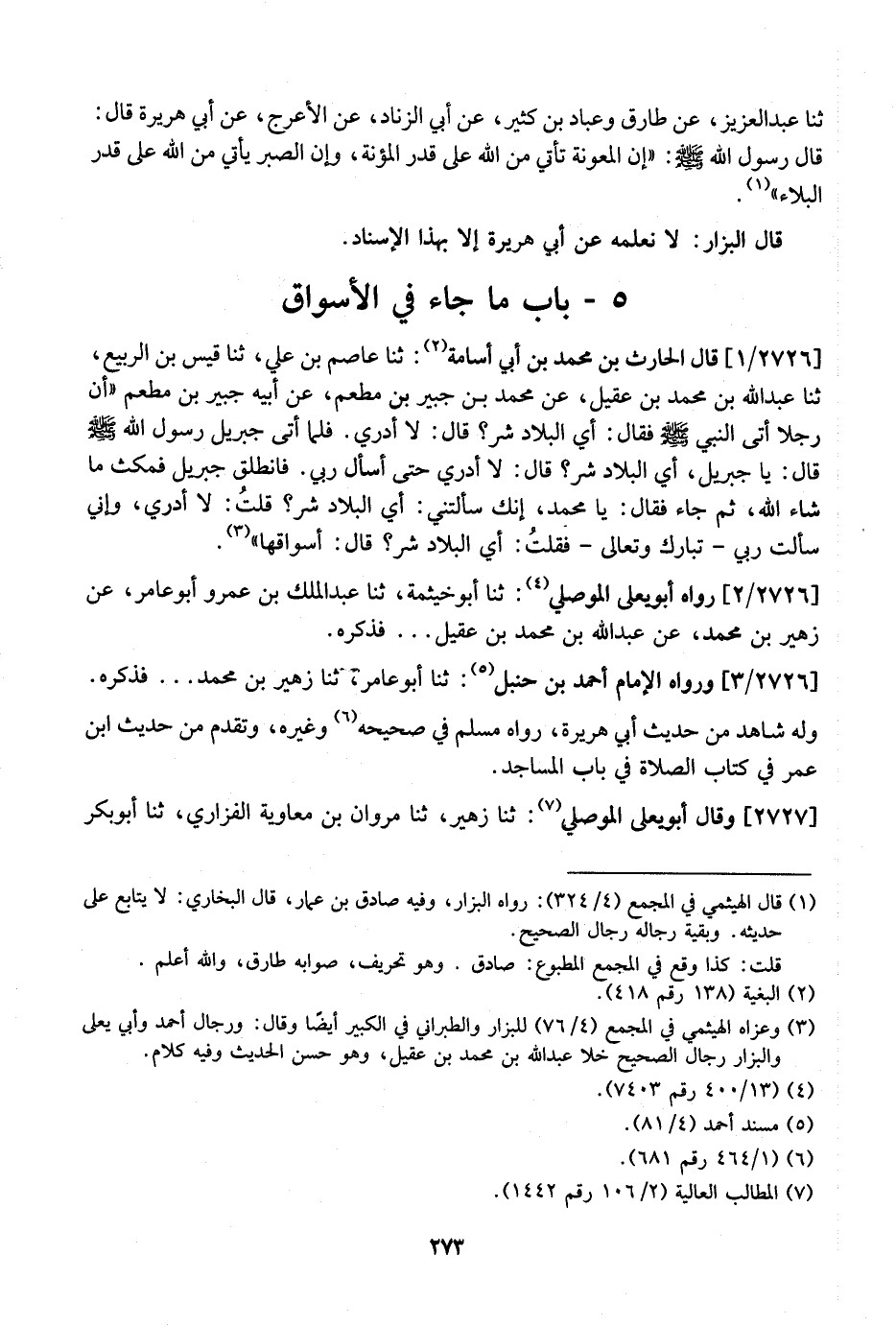 1726 / 1 - قَالَ الْحَارِثُ بْنُ مُحَمَّدِ بْنِ أَبِي أُسَامَةَ: ثَنَا عَاصِمُ بْنُ عَلِيٍّ، ثَنَا قَيْسُ بْنُ الرَّبِيعِ، ثَنَا عَبْدِ اللَّهِ بْنِ مُحَمَّدِ بْنِ عُقَيْلٍ، عَنْ مُحَمَّدِ بْنِ جُبَيْرِ بْنِ مُطْعَمٍ، عَنْ أَبِيهِ جُبَيْرِ بْنِ مُطْعَمٍ "أَنَّ رَجُلًا أَتَى النَّبِيَّ - صَلَّى اللَّهُ عَلَيْهِ وَسَلَّمَ - فَقَالَ: أَيُّ الْبِلَادِ شَرٌّ؟ قَالَ: لَا أَدْرِي. فَلَمَّا أَتَى جِبْرِيلُ رَسُولَ اللَّهِ - صَلَّى اللَّهُ عَلَيْهِ وَسَلَّمَ - قَالَ: يَا جِبْرِيلُ، أَيُّ الْبِلَادِ شَرٌّ؟ قَالَ: لَا أَدْرِي حَتَّى أَسْأَلَ رَبِّي. فَانْطَلَقَ جِبْرِيلُ فَمَكَثَ مَا شَاءَ اللَّهُ، ثُمَّ جَاءَ فَقَالَ: يَا مُحَمَّدُ، إِنَّكَ سَأَلْتَنِي: أَيُّ الْبِلَادِ شَرٌّ؟ قلتُ: لَا أَدْرِي، وَإِنِّي سَأَلْتُ رَبِّي- تَبَارَكَ وَتَعَالَى- فقلتُ: أَيُّ الْبِلَادِ شَرٌّ؟ قَالَ: أَسْوَاقُهَا".