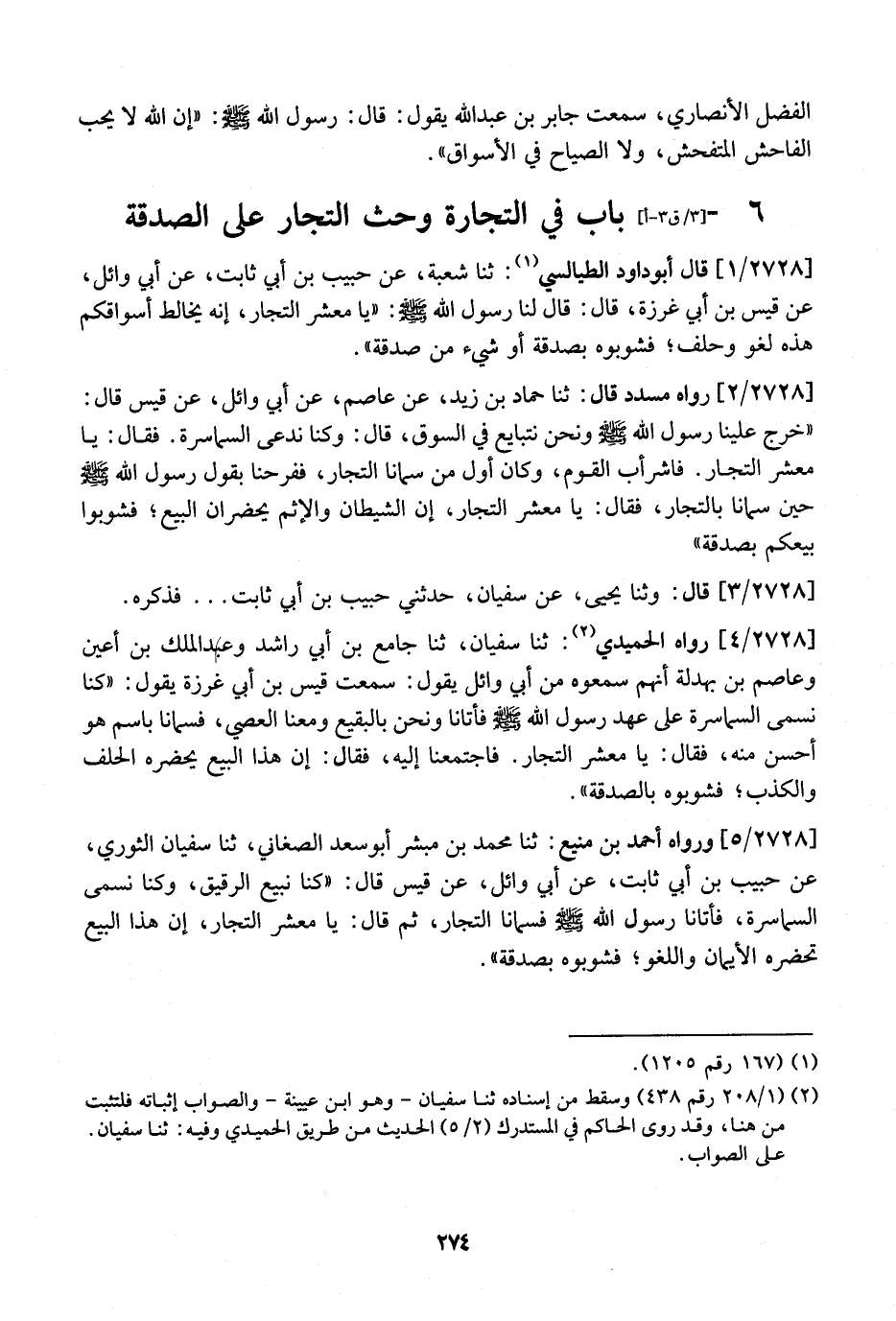 2728 / 4 - رواه الْحُمَيْدِيُّ: ثنا سُفْيَانُ، ثنا جَامِعُ بْنُ أَبِي رَاشِدٍ وَعَبْدُ الْمَلِكِ بْنِ أَعْيُنٍ وَعَاصِمُ بْنُ بَهْدَلَةَ أَنَّهُمْ سَمِعُوهُ مِنْ أَبِي وَائِلٍ يَقُولُ: سمعت قيس بن أبي غرزة يَقُولُ: "كُنَّا نُسَمَّى السَّمَاسِرَةَ عَلَى عَهْدِ رَسُولِ اللَّهِ - صَلَّى اللَّهُ عَلَيْهِ وَسَلَّمَ - فَأَتَانَا وَنَحْنُ بِالْبَقِيعِ وَمَعَنَا الْعِصِيُّ، فَسَمَّانَا بِاسْمٍ هُوَ أَحْسَنُ مِنْهُ، فَقَالَ: يَا مَعْشَرَ التُّجَّارِ. فَاجْتَمَعْنَا إِلَيْهِ، فَقَالَ: إِنَّ هَذَا الْبَيْعَ يَحْضُرُهُ الْحَلْفُ وَالْكَذِبُ؛ فَشُوبُوهُ بِالصَّدَقَةِ".
