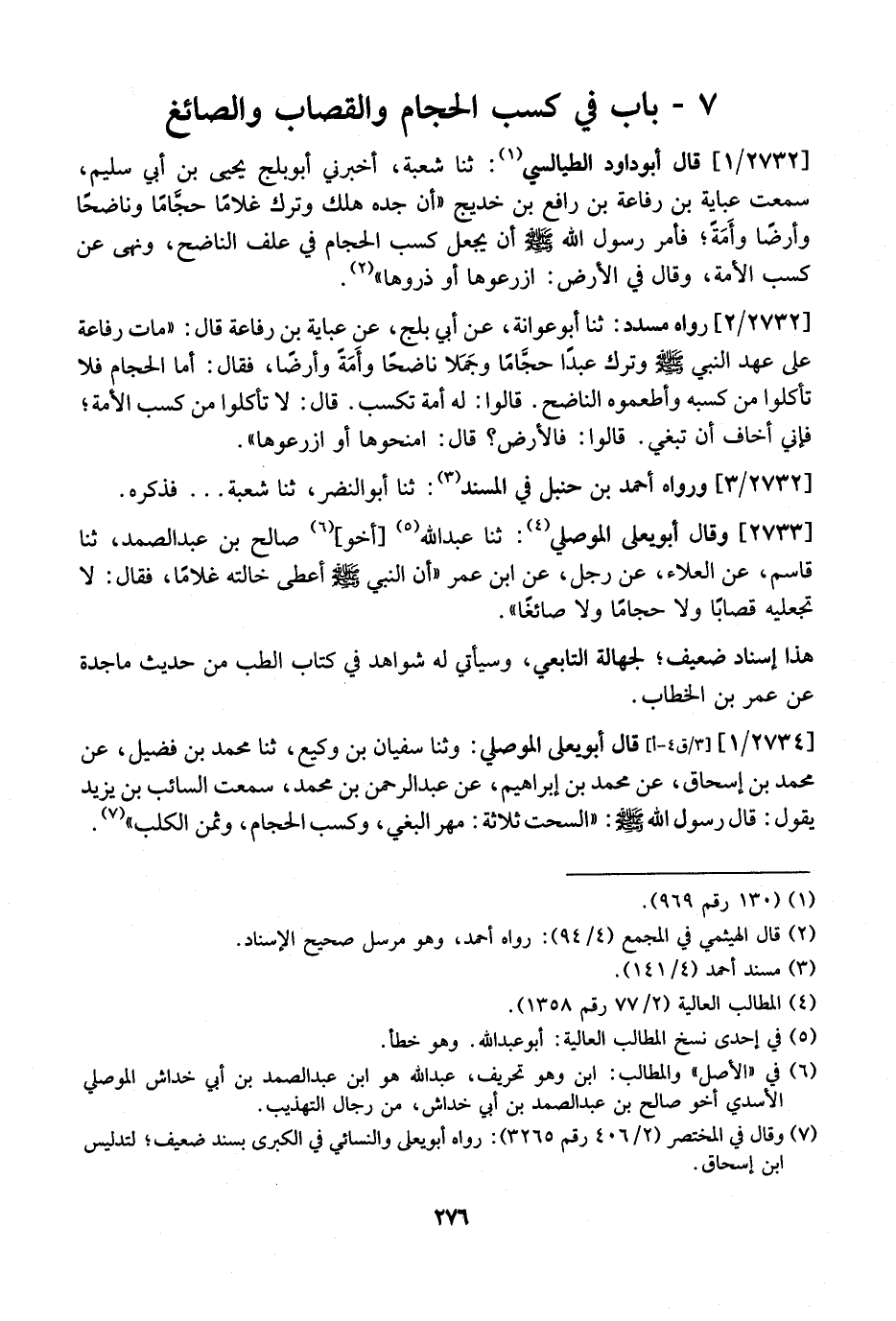 2732 / 2 - رَوَاهُ مُسَدَّدٌ: ثنا أَبُو عَوَانَةَ، عَنْ أَبِي بَلْجَ، عَنْ عَبَايَةَ بْنِ رِفَاعَةَ قَالَ: "مَاتَ رِفَاعَةُ عَلَى عَهْدِ النَّبِيِّ - صَلَّى اللَّهُ عَلَيْهِ وَسَلَّمَ - وَتَرَكَ عَبْدًا حجَّامًا وجَمَلا نَاضِحًا وأَمَةً وَأَرْضًا، فَقَالَ: أَمَّا الْحَجَّامُ فَلَا تَأْكُلُوا مِنْ كَسْبِهِ وَأَطْعِمُوهُ النَّاضِحَ. قَالُوا: لَهُ أَمَةٌ تَكْسِبُ. قَالَ: لَا تَأْكُلُوا مِنْ كَسْبِ الْأَمَةِ؛ فَإِنِّي أَخَافُ أَنْ تَبْغِي. قَالُوا: فَالْأَرْضُ؟ قَالَ: امْنَحُوهَا أَوِ ازْرَعُوهَا".