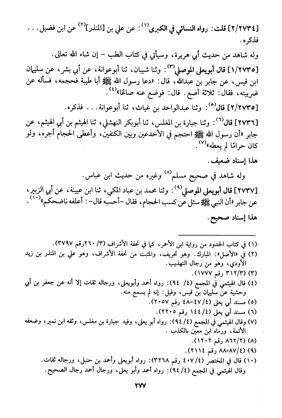 2737 - قَالَ أَبُو يَعْلَى الْمَوْصِلِيُّ: وثنا مُحَمَّدُ بْنُ عباد المكي، ثنا ابْنُ عُيَيْنَهَ، عَنْ أَبِي الزُّبَيْرِ، عَنْ جَابِرٍ "أَنّ النَّبِيَّ - صَلَّى اللَّهُ عَلَيْهِ وَسَلَّمَ - سُئِلَ عَنْ كَسْبِ الْحَجَّامِ، فَقَالَ- أَحْسَبُهُ قَالَ-: أَعْلِفْهُ نَاضِحَكُمْ ". هَذَا إِسْنَادٌ صَحِيحٌ.